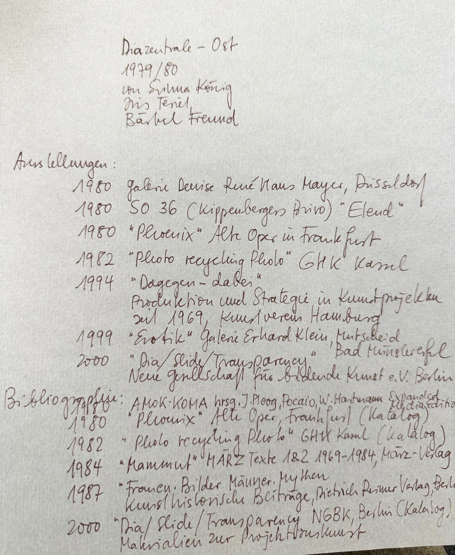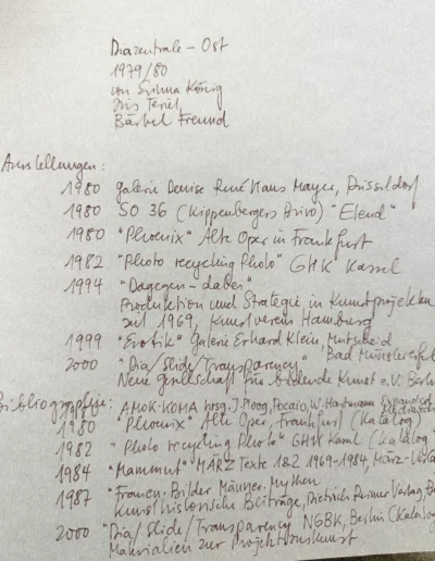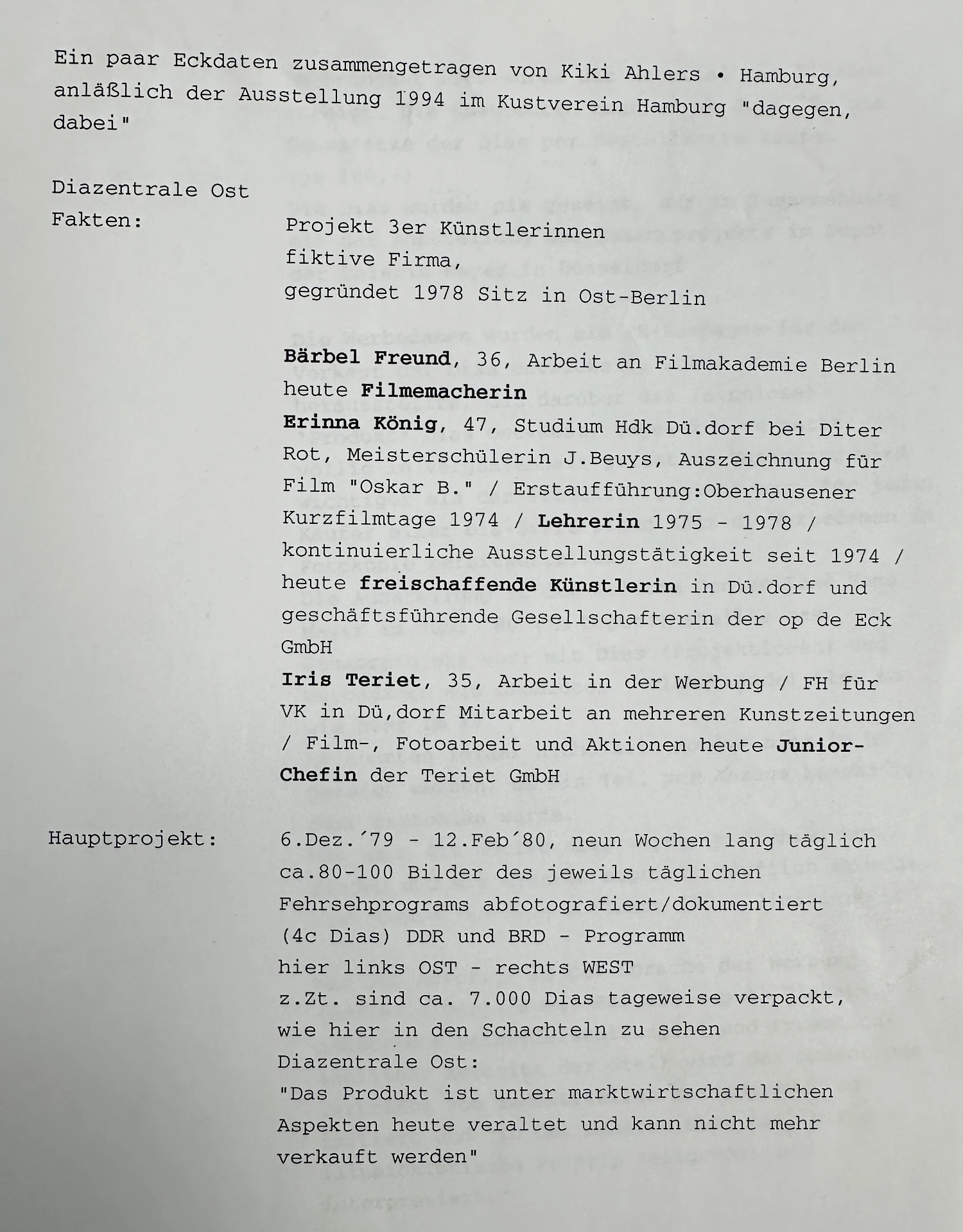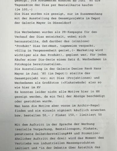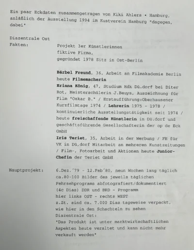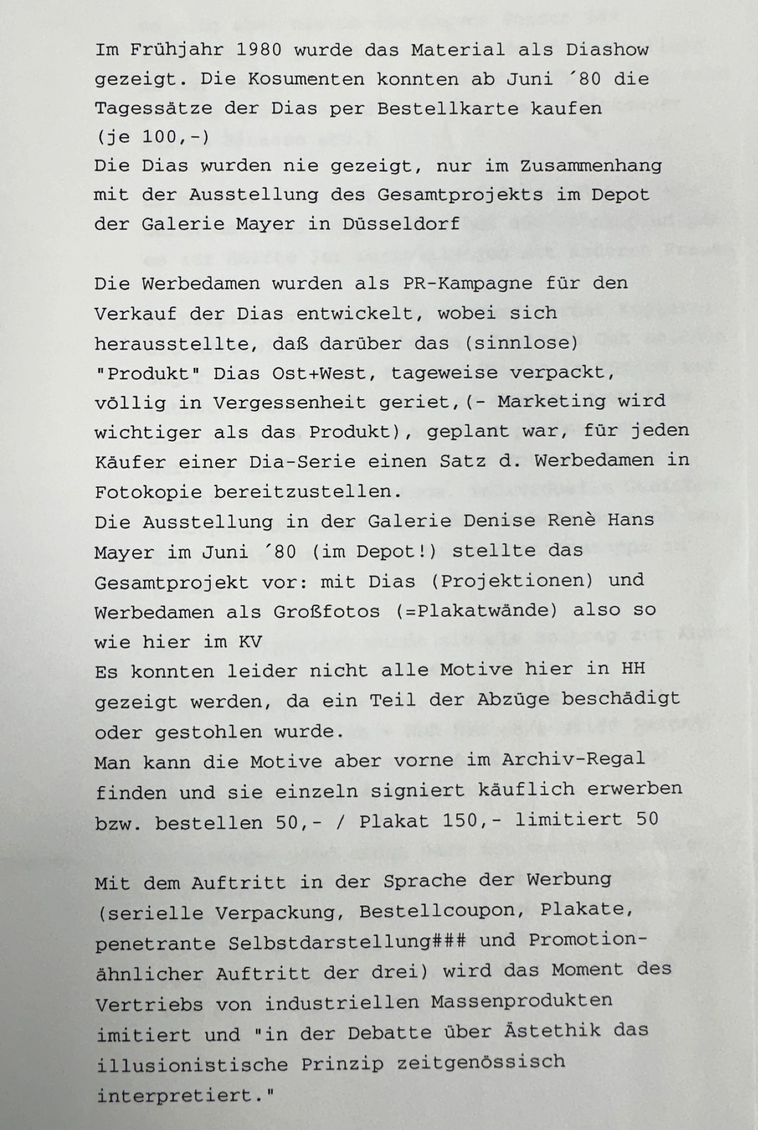 Das Angebot en gros umfaßt 6000 Dias (3000 BRD, 3000 DDR), aufgenommen vom Fernsehen in der Zeit vom 8.12.’79 bis zum 10.7.’80. En detail ist es möglich, die Diaproduktion eines Abends zu erwerben: haben nicht auch Sie einen besonders schönen Fernsehabend verlebt, der es verdient, festgehalten zu werden?