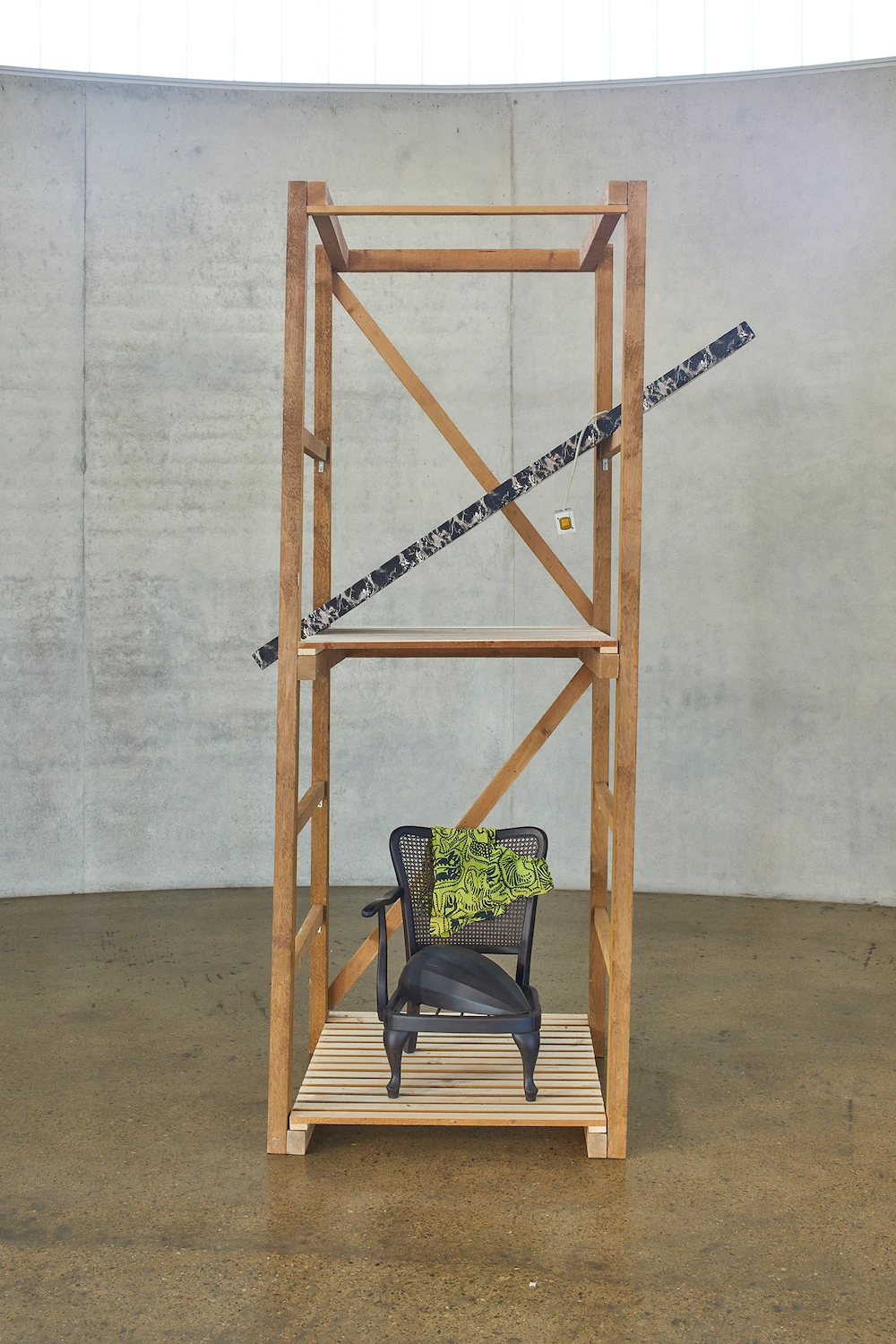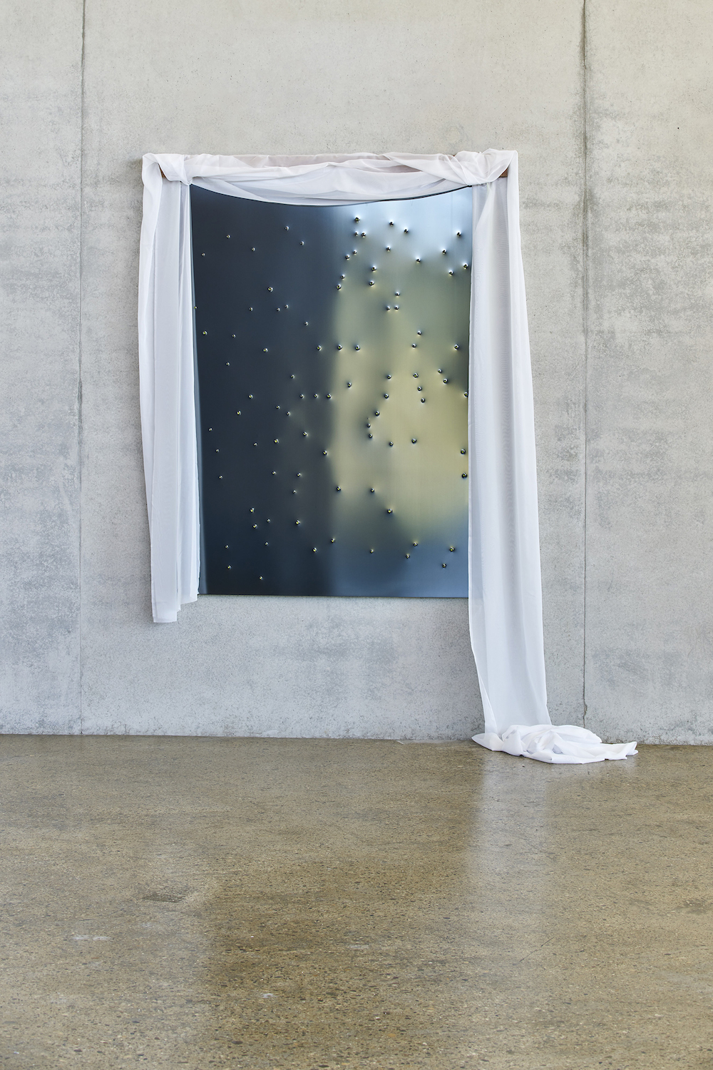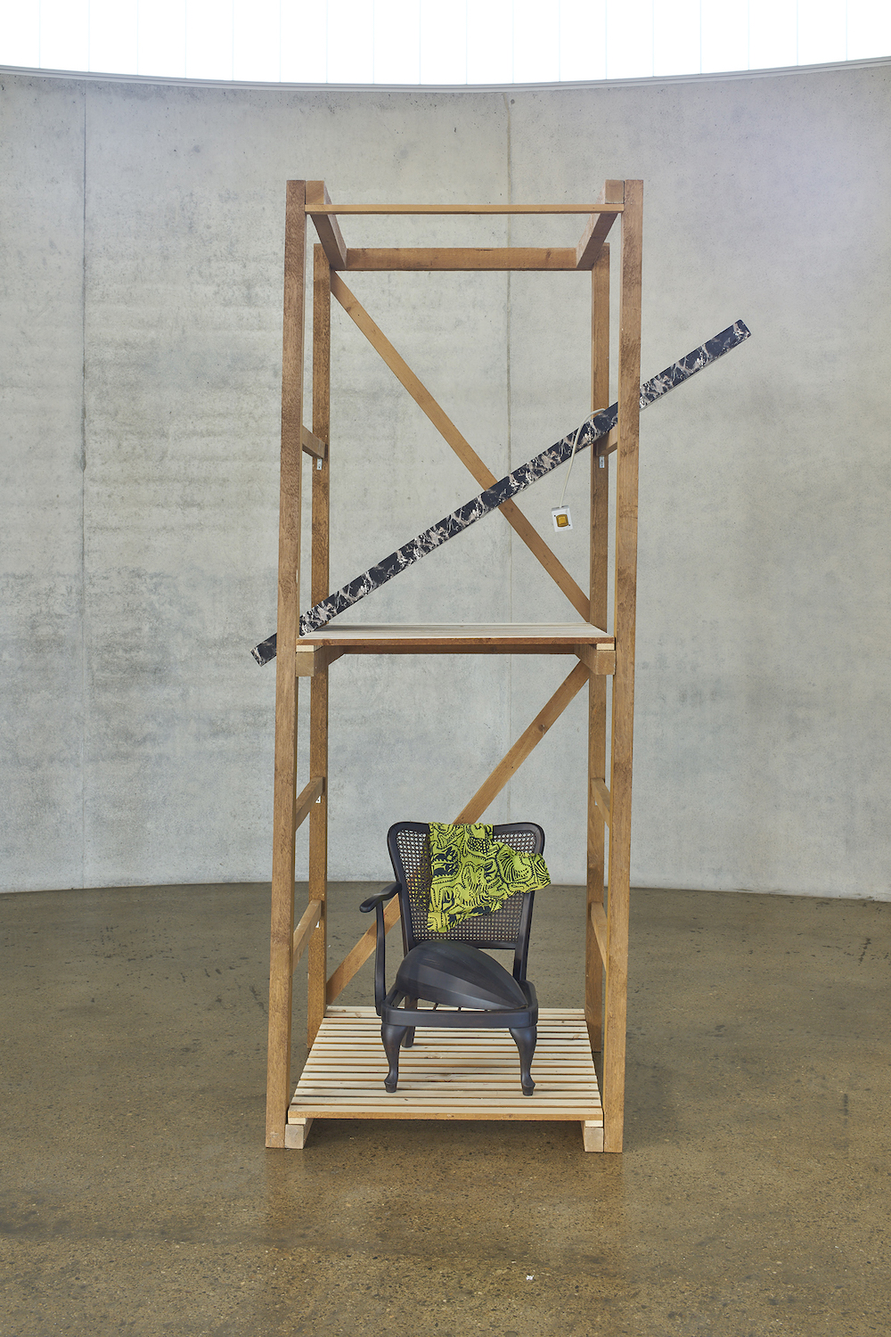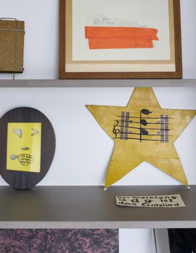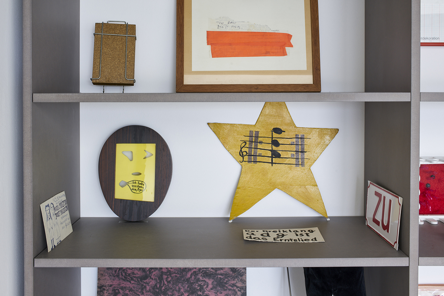 Die wie Schilder angebrachten Kalligraphien oszillieren zwischen dem Entzifferbaren und der freien Arabeske, so wie die teerschwarzen Schatten auf der Wand. Die Zeichen appellieren an den Blick. Dies tun die Falten des rosafarbenen Frotteetuchs, in denen man ein Antlitz vermutet, ähnlich der stoffdrapierten Nacht. In Erinna Königs Werken gibt es keine eindeutige Geschichte, die vorgetragen wird, kein Rätsel, das sich auflösen lässt. Aus den Fundstücken wird ein vieldeutiges Bild, eine Metapher, in der sich jedes Teil zu einem zuvor ungesehenen Ganzen fügt.
