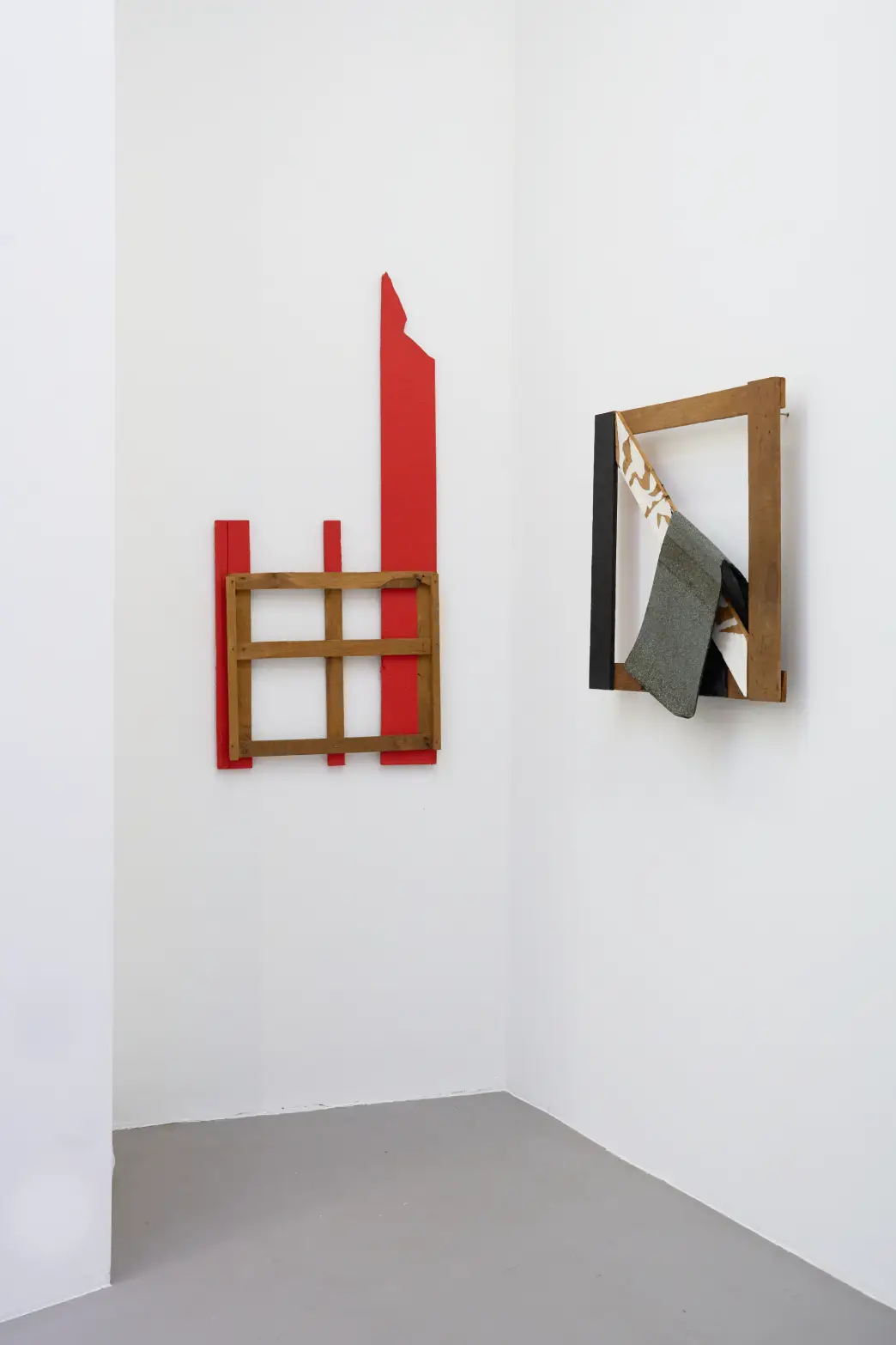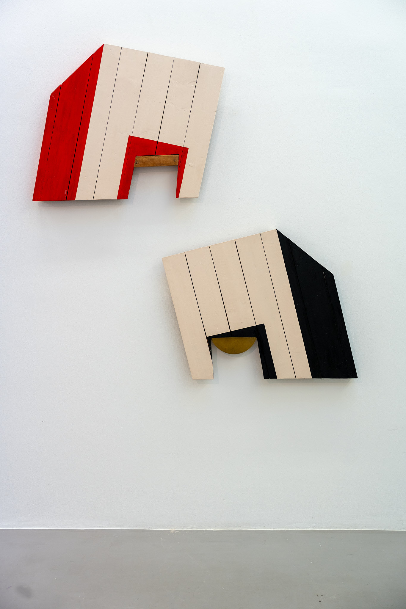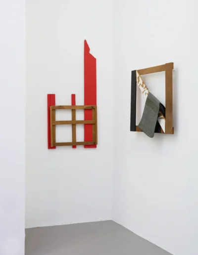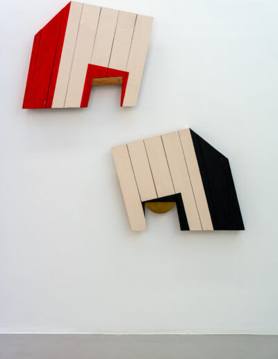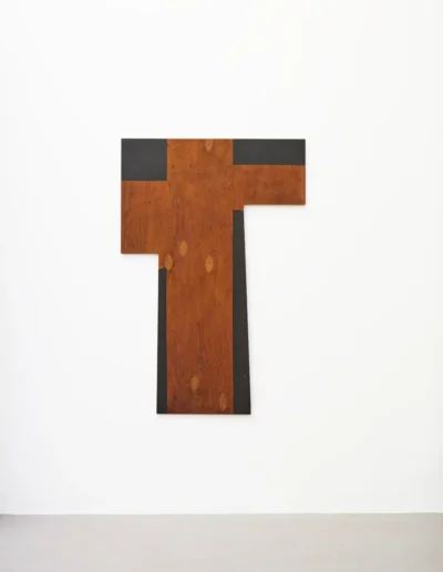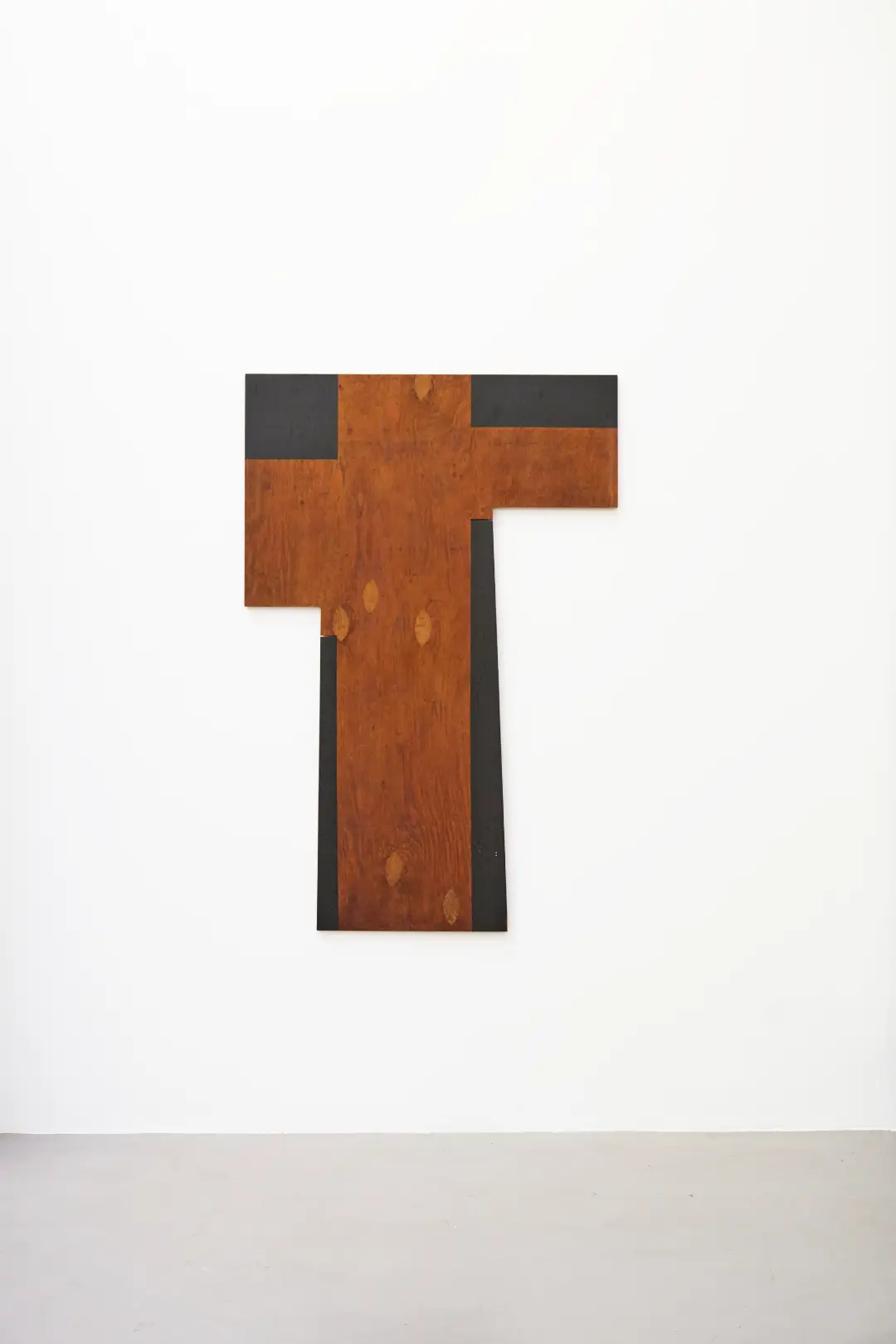 “O T Diagonale I’ 1984 ist ein barer Holzrahmen mit einem Stück Dachteerplane. Allerweltsmaterialien werden defunktionalisiert und komponiert. O.T. (Kreuz mit Schatten), 1983 das asymmetrische Werk aus Sperrholz mit Acrylfarbe spricht für sich, und ‘Lambertus,’ 1984 schließt die Gruppe mit Referenz zu dem Düsseldorfer Wahrzeichen Sankt Lambertus in der Altstadt.