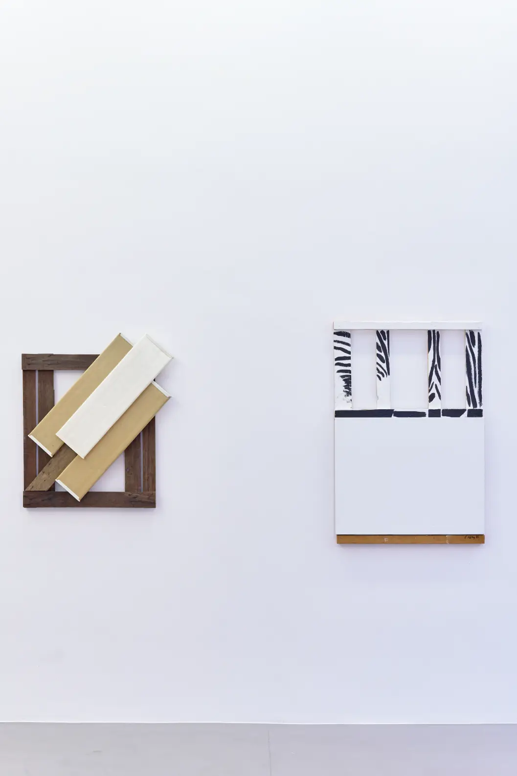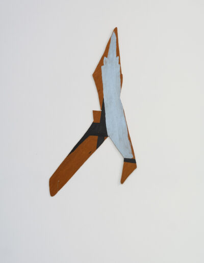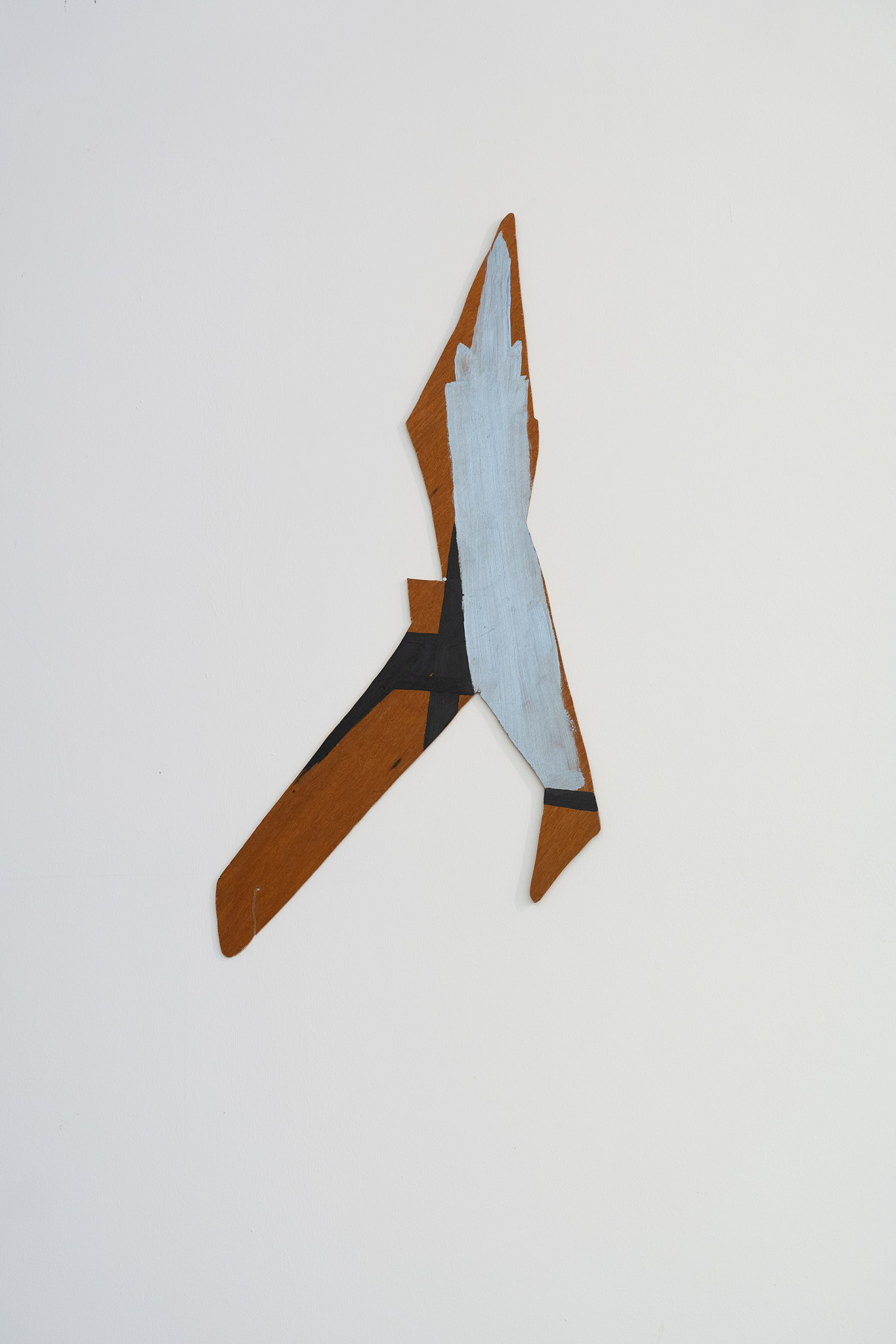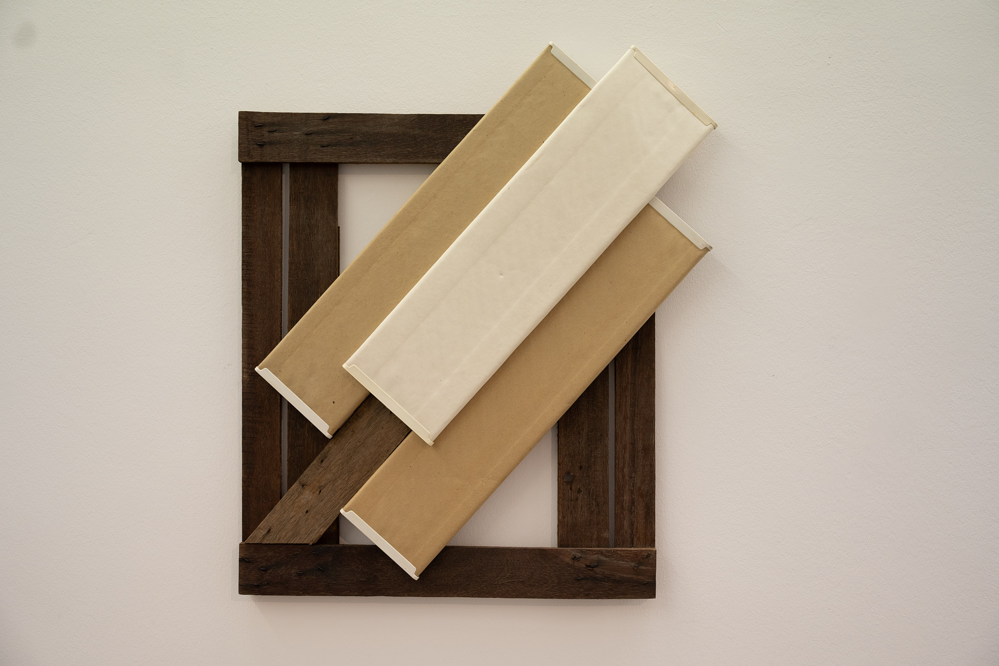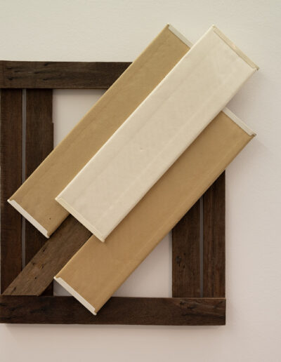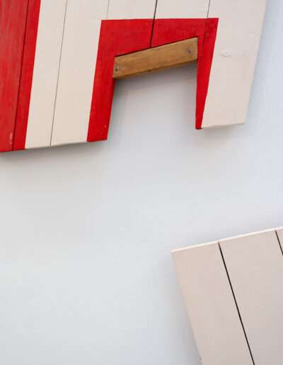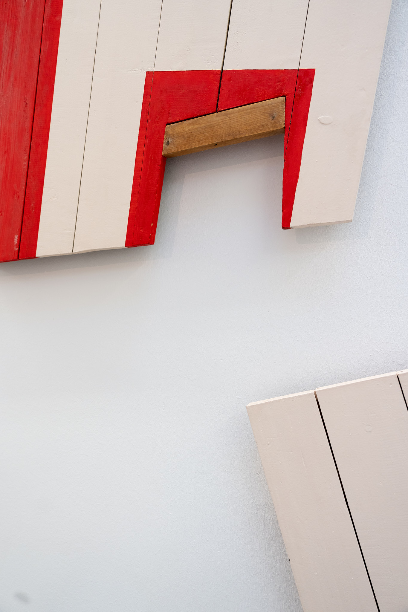 “O T Diagonale I’ 1984 ist ein barer Holzrahmen mit einem Stück Dachteerplane. Allerweltsmaterialien werden defunktionalisiert und komponiert. O.T. (Kreuz mit Schatten), 1983 das asymmetrische Werk aus Sperrholz mit Acrylfarbe spricht für sich, und ‘Lambertus,’ 1984 schließt die Gruppe mit Referenz zu dem Düsseldorfer Wahrzeichen Sankt Lambertus in der Altstadt.