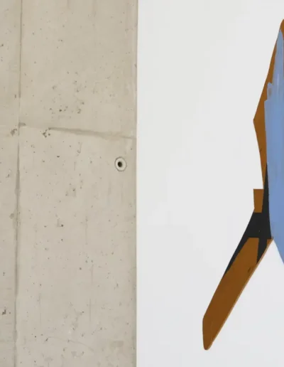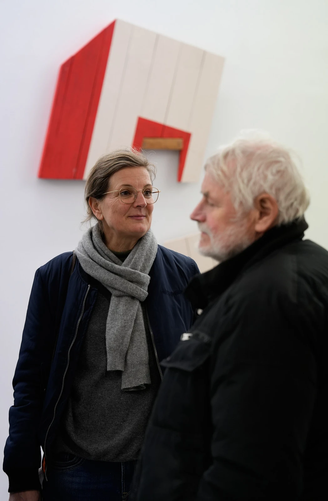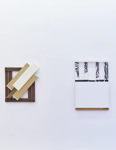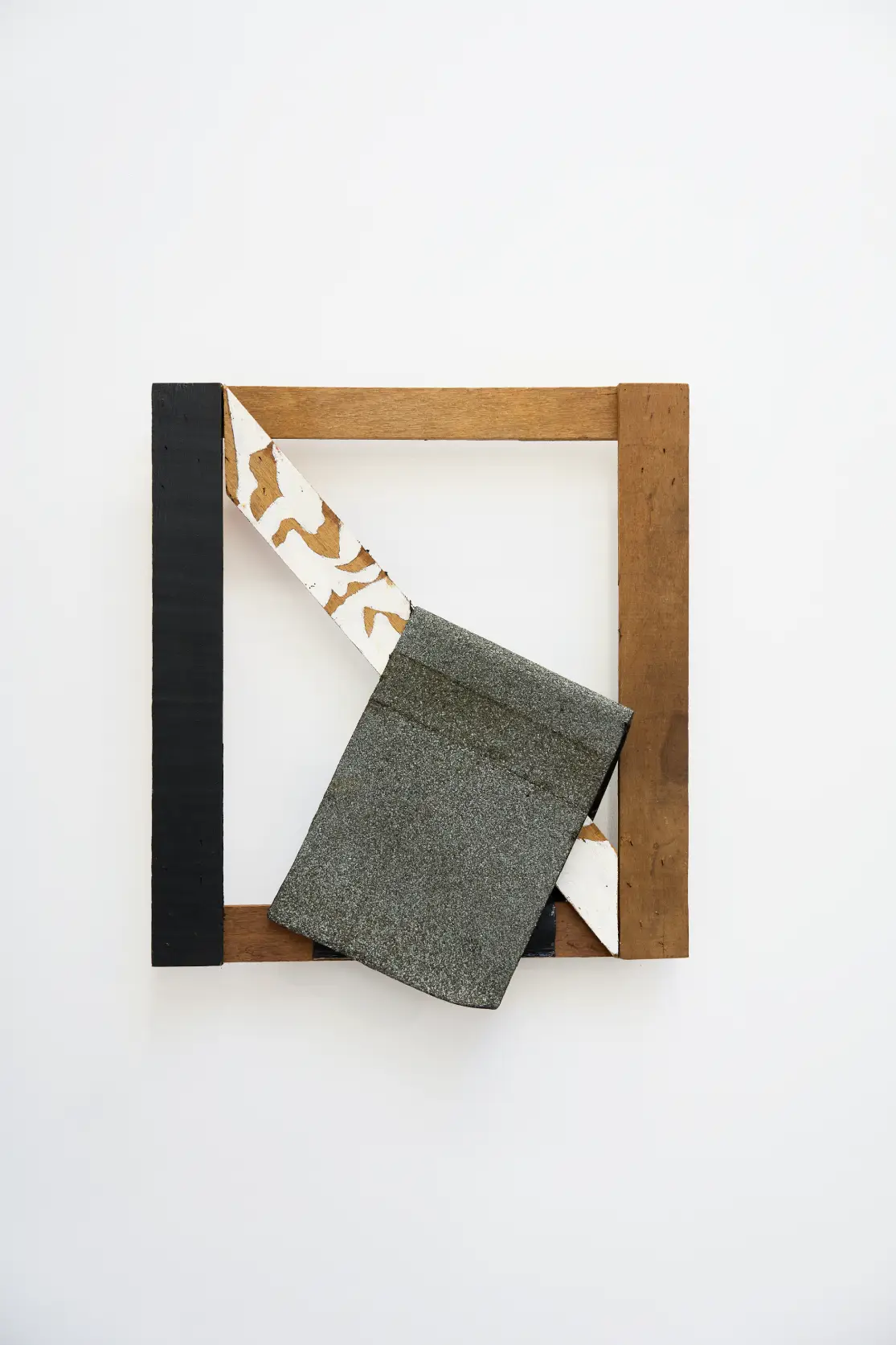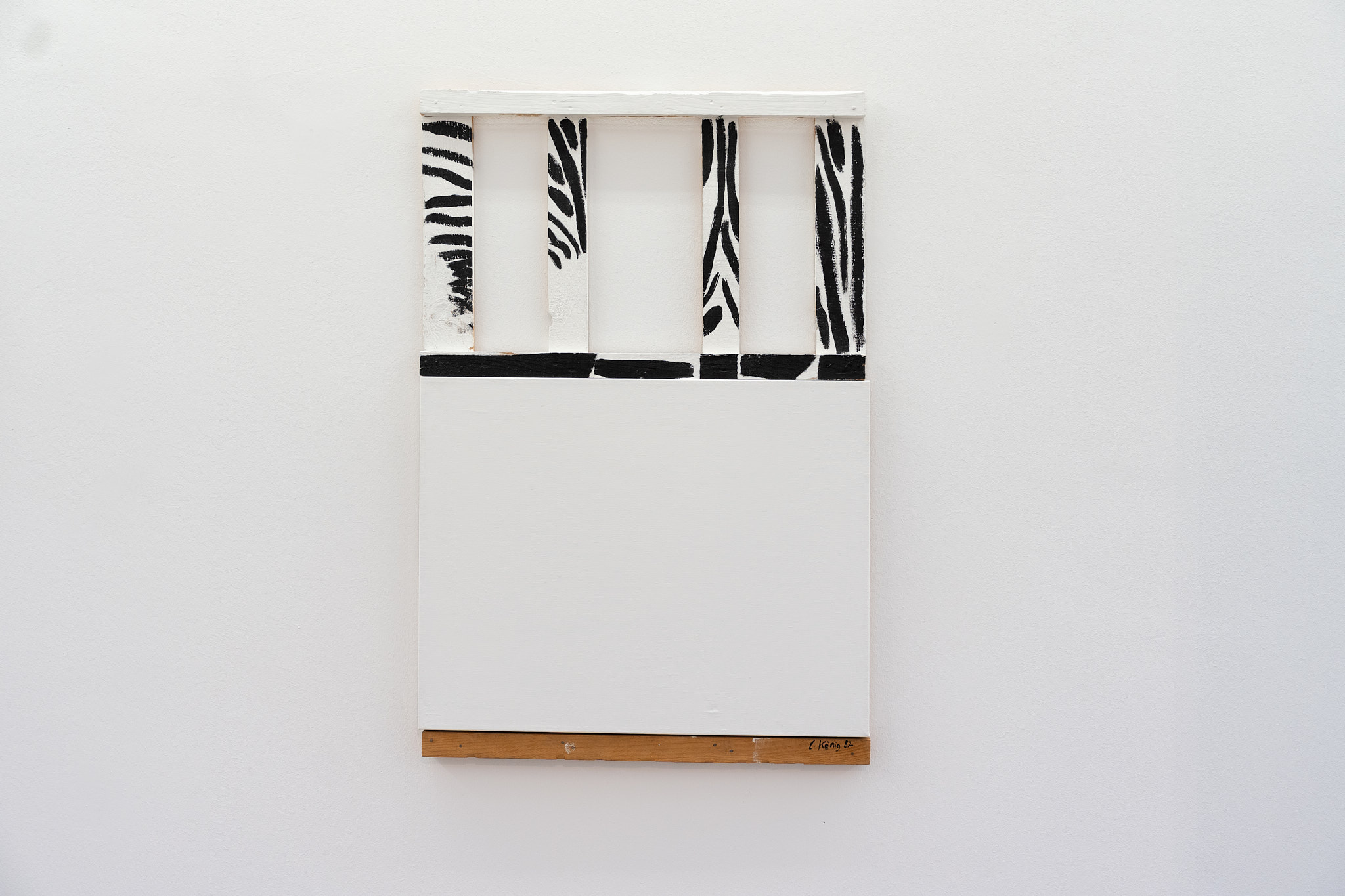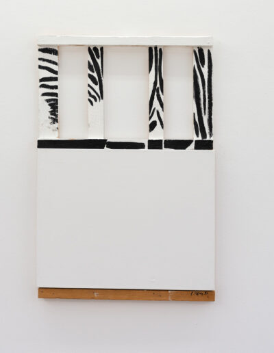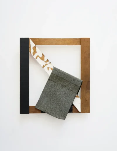 “O T Diagonale I’ 1984 ist ein barer Holzrahmen mit einem Stück Dachteerplane. Allerweltsmaterialien werden defunktionalisiert und komponiert. O.T. (Kreuz mit Schatten), 1983 das asymmetrische Werk aus Sperrholz mit Acrylfarbe spricht für sich, und ‘Lambertus,’ 1984 schließt die Gruppe mit Referenz zu dem Düsseldorfer Wahrzeichen Sankt Lambertus in der Altstadt.