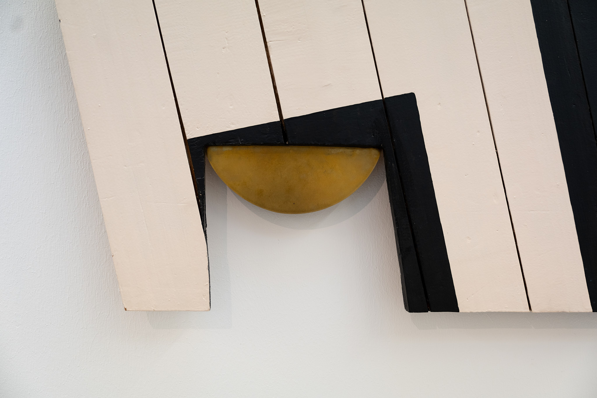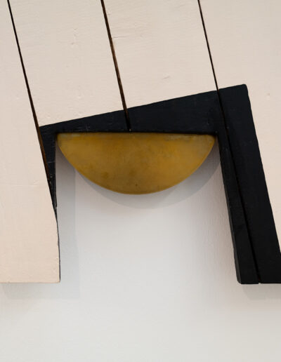 ‘O. T.’ 1989/2009 sind Teile einer Wandvertäfelung, die bemalt, ausgeschnitten und mit Holz und einem Messingkreis in eine vieldeutige Doppelkomposition verwandelt ist.