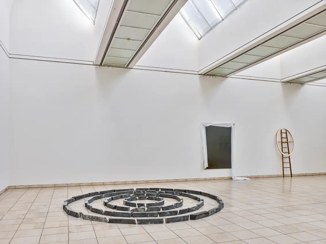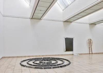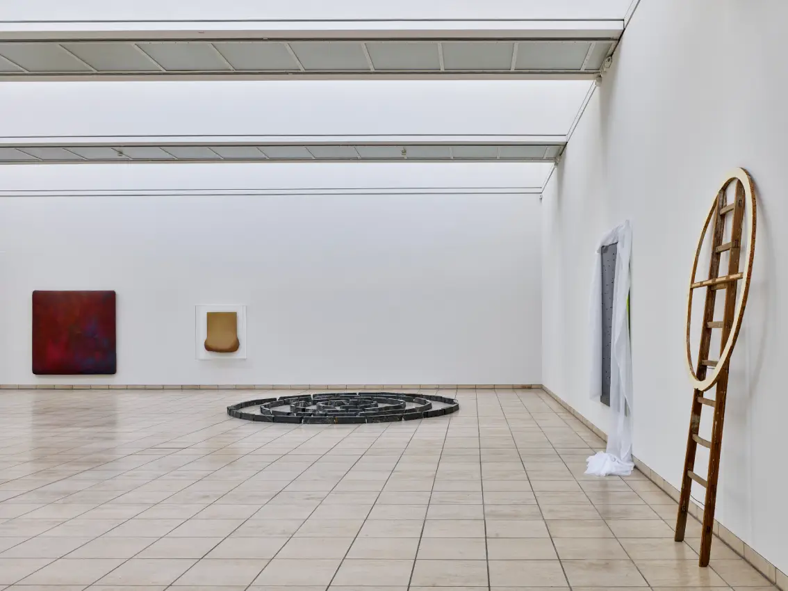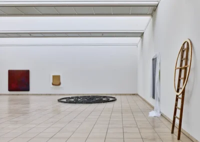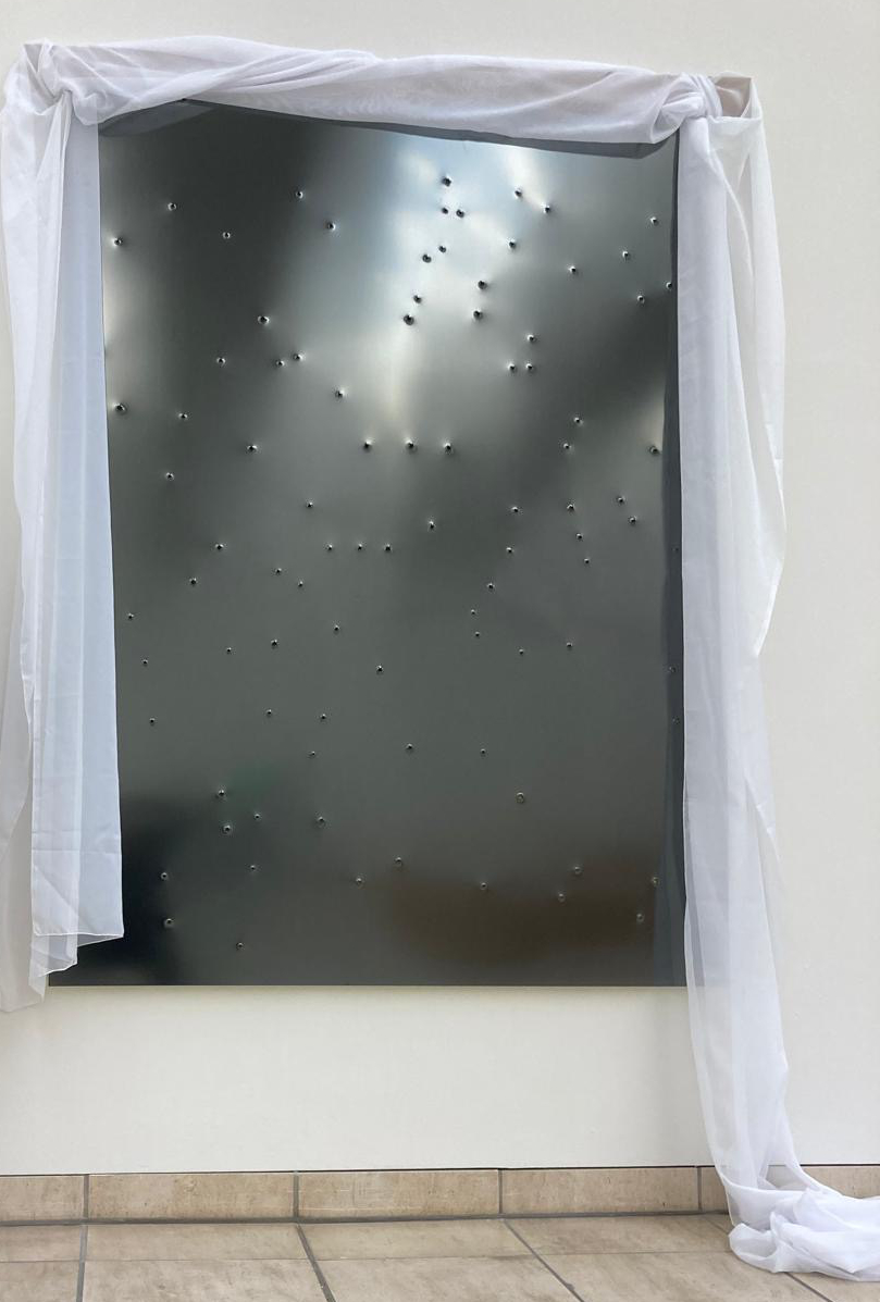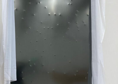 Like Fontana's works, the works of Düsseldorf artist Erinna König (1947–2021) open up new perspectives on space, material, and surface. The work “Night” clearly shows how Erinna König engaged with the art and theories of Lucio Fontana in her work. Erinna König has developed Fontana's gesture of piercing in her own unique way. The work consists of a metal plate made of dark-colored stainless steel that has been pierced with a sharp object. The work is framed by a semi-transparent white curtain that is draped asymmetrically and reaches to the floor on the right-hand side.