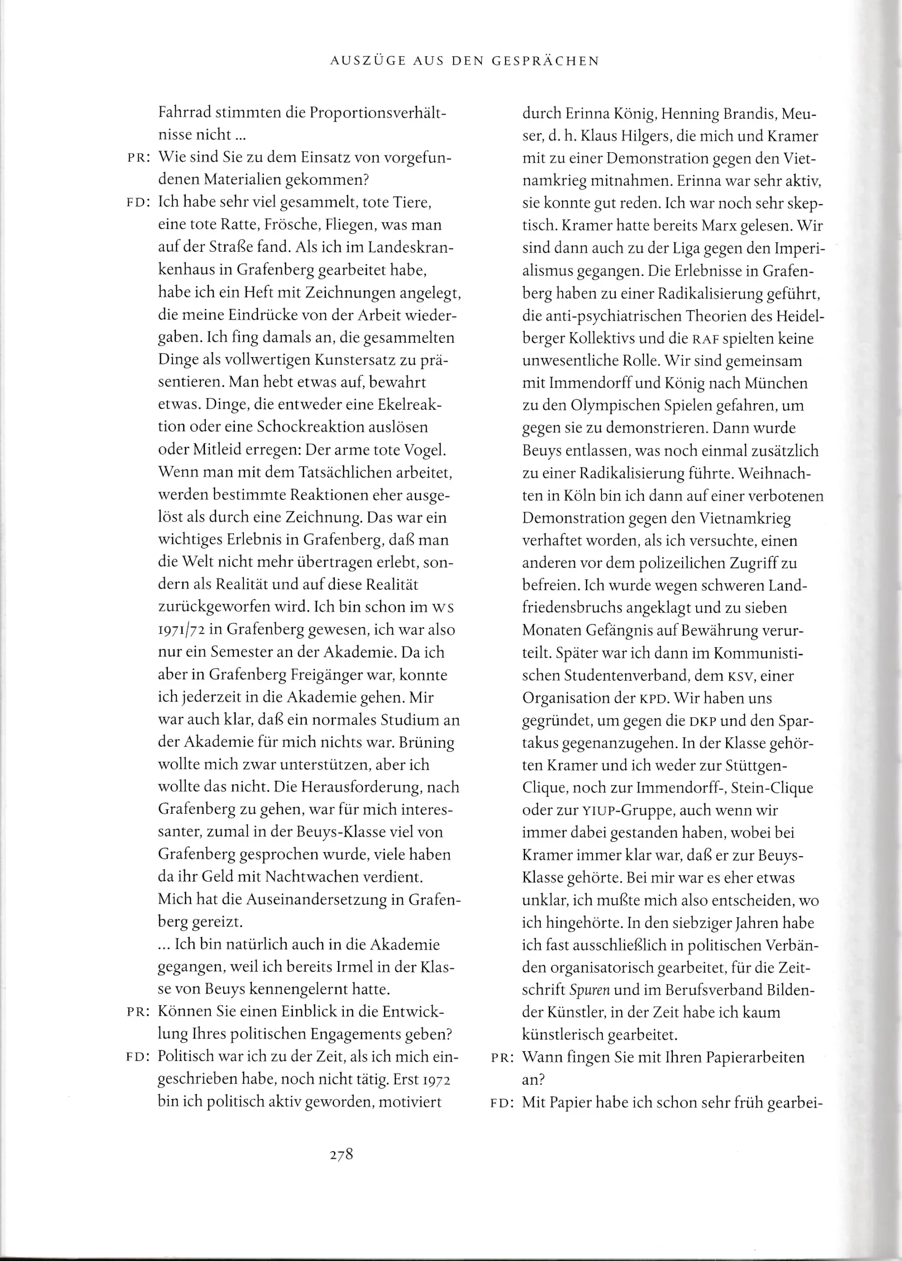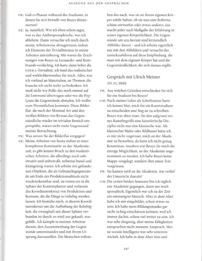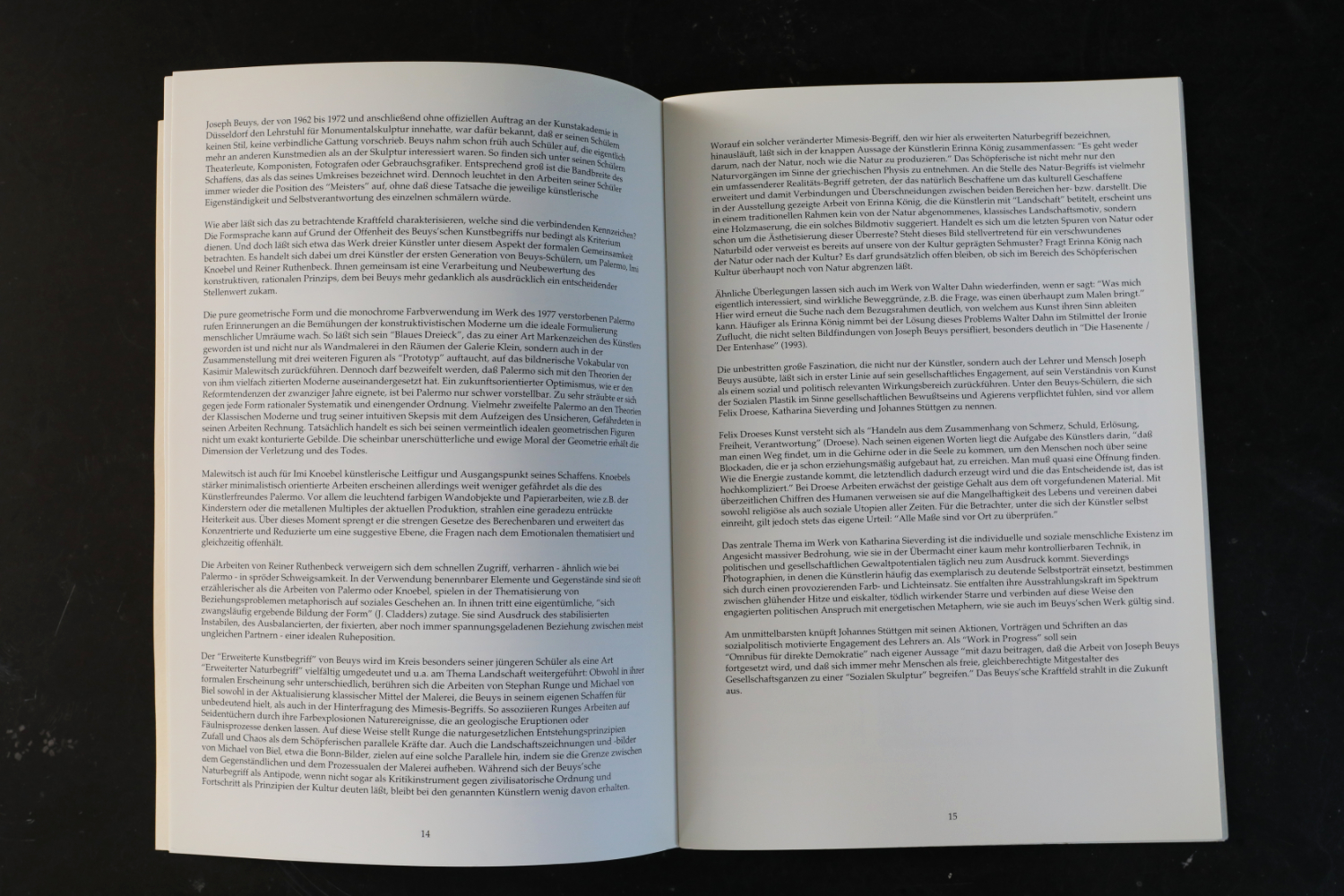 […] Der “Erweiterte Kunstbegriff” von Beuys wird im Kreis besonders seiner jüngeren Schüler als seine Art “Erweiterter Naturbegriff” vielfältig umgededeutet und u.a. am Thema Landschaft weitergeführt: Obwohl in ihrer formalen Erscheinung sehr unterschiedlich, berühren sich die Arbeiten von Stephan Runge und Michael von Biel sowohl in der Aktualisierung klassischer Mittel der Malerei, die Beuys in seinem eigenen Schaffen für unbedeutend hielt, als auch in der Hinterfragung des Mimesis-Begriffs. So assoziieren Runges Arbeiten auf Seidentüchern durch ihre Farbexplositionen Naturereignisse, die an geologische Eruptionen oder Fäulnisprozesse denken lassen. Auf diese Weise stellt Runge die naturgesetzlichen Entstehungsprinzipien von Zufall und Chaos als dem Schöpferischen parallele Kräfte dar. Auch die Landschaftsbezeichnungen und -bilder von Michael von Biel, etwas die Bonn-Bilder zielen auf solche Parallelen hin, indem sie die Grenze zwischen dem Gegenständlichen und dem Prozessualen der Malerei aufheben. Während sich der Beuys’sche Naturbegriff als Antipode, wenn nicht sogar als Kritikinstrument gegen zivisilatorische Ordnung und Fortschritt als Prinzipien der Kultur deuten läßt, bleibt bei den genannten Künstlern wenig davon erhalten.