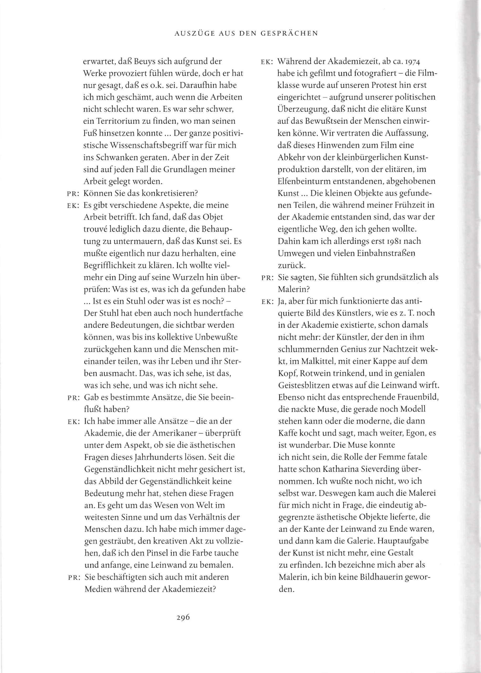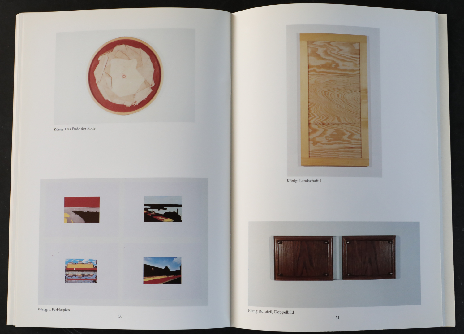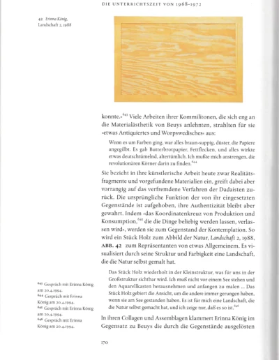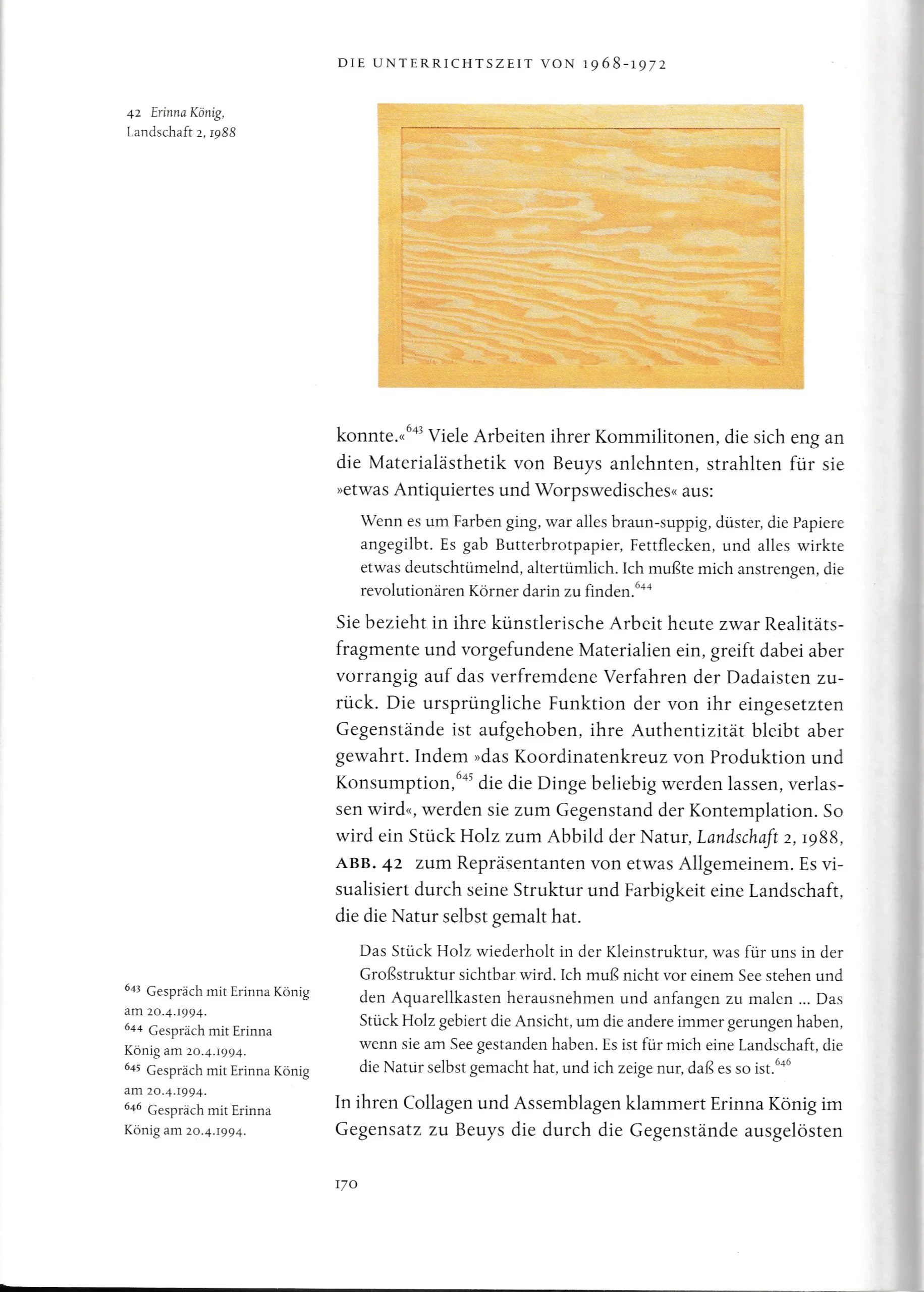 Worauf ein solcher veränderter Mimesis-Begriff den wir hier als erweiterten Naturbegriff bezeichnen, hinausläuft, läßt such in der knappen Aussage der Künstlerin Erinna König zusammenfassen. “Es geht weder darum, nach der Natur, noch wie die Natur zu produzieren.” Das Schöpferische ist nicht mehr nur den Naturvorgängen im Sinne der griechischen Physys zu entnehmen. An die Stelle des Natur-Begriffs ist vielmehr ein umfassender Realitäts-Begriff getreten, der das natürlich Beschaffene um das kulturell Geschaffene erweitert und damit Verbindungen und Überschneidungen zwischen beiden Bereichen her- bzw darstellt. Die in der Ausstellung gezeigte Arbeit von Erinna König, die die Künstlerin mit ‘Landschaft’ betitelt, erscheint uns in einem traditionellen Rahmen kein von der Natur abgenommenes, klassisches Landschaftsmotiv, sondern eine Holzmaserung, die ein solches Bildmotiv suggeriert. Handelt es sich um die letzten Spuren von Natur oder schon um die Ästethisierung dieser Überreste? Steht dieses Bild stellvertretend für ein verschwundenes Naturbildo der verweist es bereits auf unsere von der Kultur geprägten Sehmuster? Fragt Erinna König nach der Natur oder nach der Kultur? Es darf grunsätzlich offen bleiben, ob sic him Bereich des Schöpferischen Kultur überhaupt noch von der Natur abgrenzen läßt.