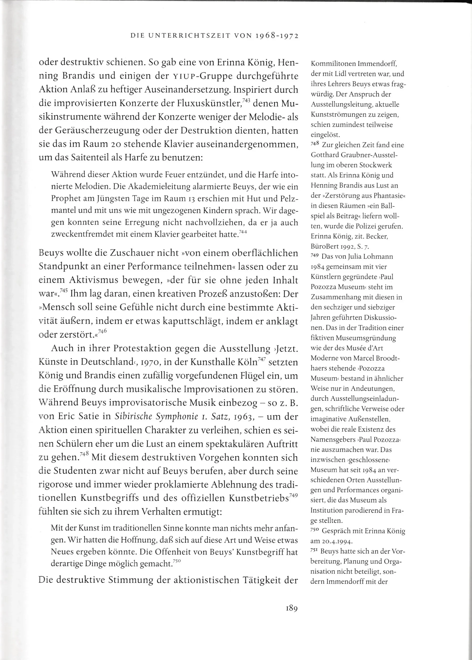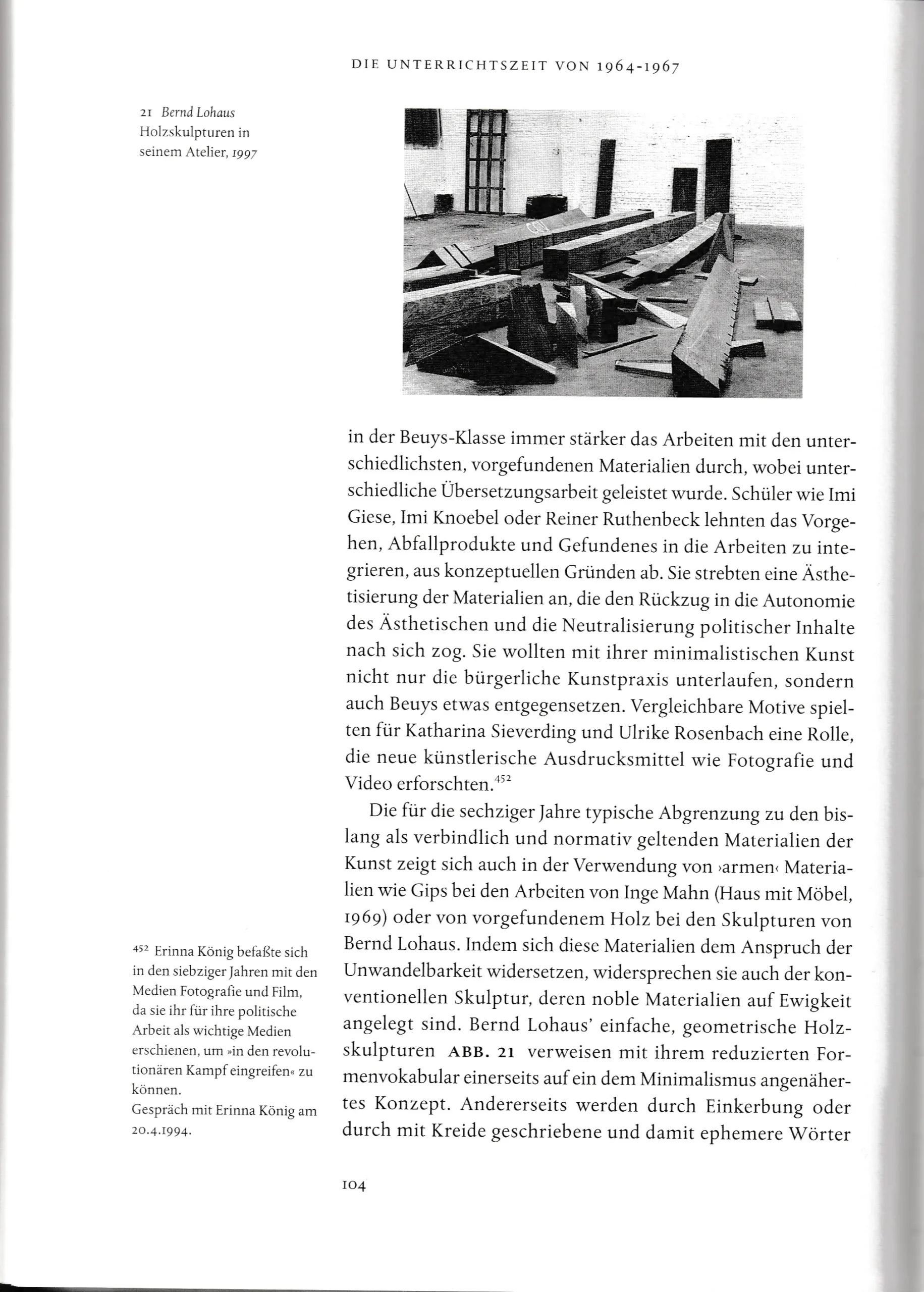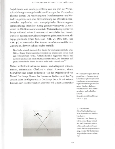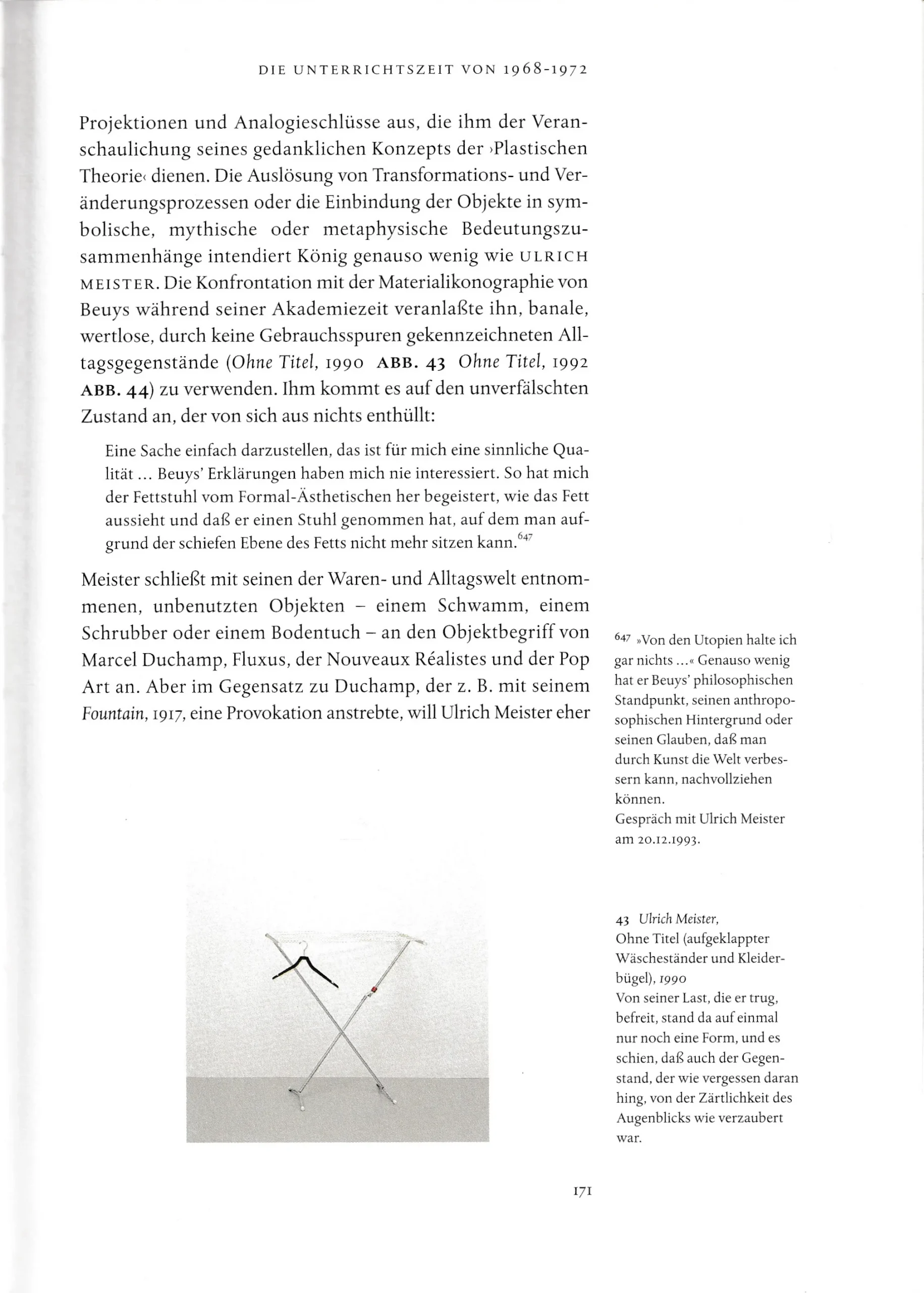 Ähnliche Überlegungen lassen sich auch im Werk von Walter Dahn wiederfinden, wenn er sagt:”Was mich eigentlich interessiert, sind wirkliche Beweggründe, z B die Frage, was einen überhaupt zum Malen bringt.” Hier wird erneut die Suchen ach dem Bezugsrahmen deutlich, von welchem aus Kunst ihren Sinn ableiten kann. Häufiger als Erinna König nimmt bei der Lösung dieses Problemes Walter Dahn im Stilmittel der Ironie Zuflucht, die nicht selten Bildfindungen von Joseph Beuys persifiert, besonders deutlich in “Die Hasenente/ der Entenhase” (1993). […]