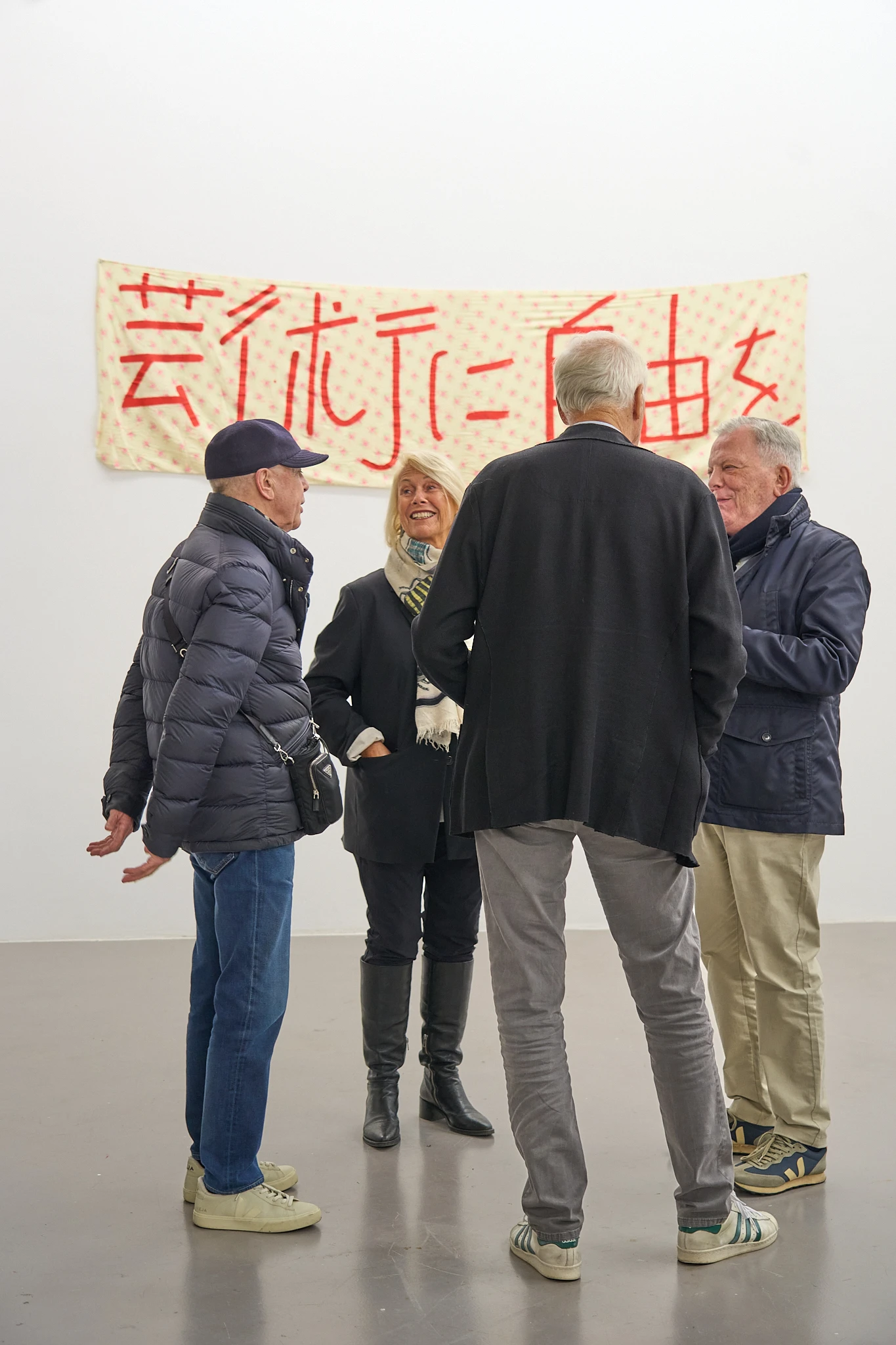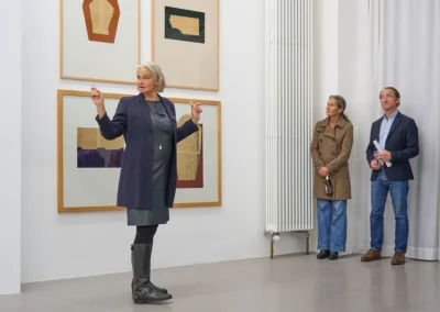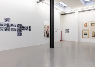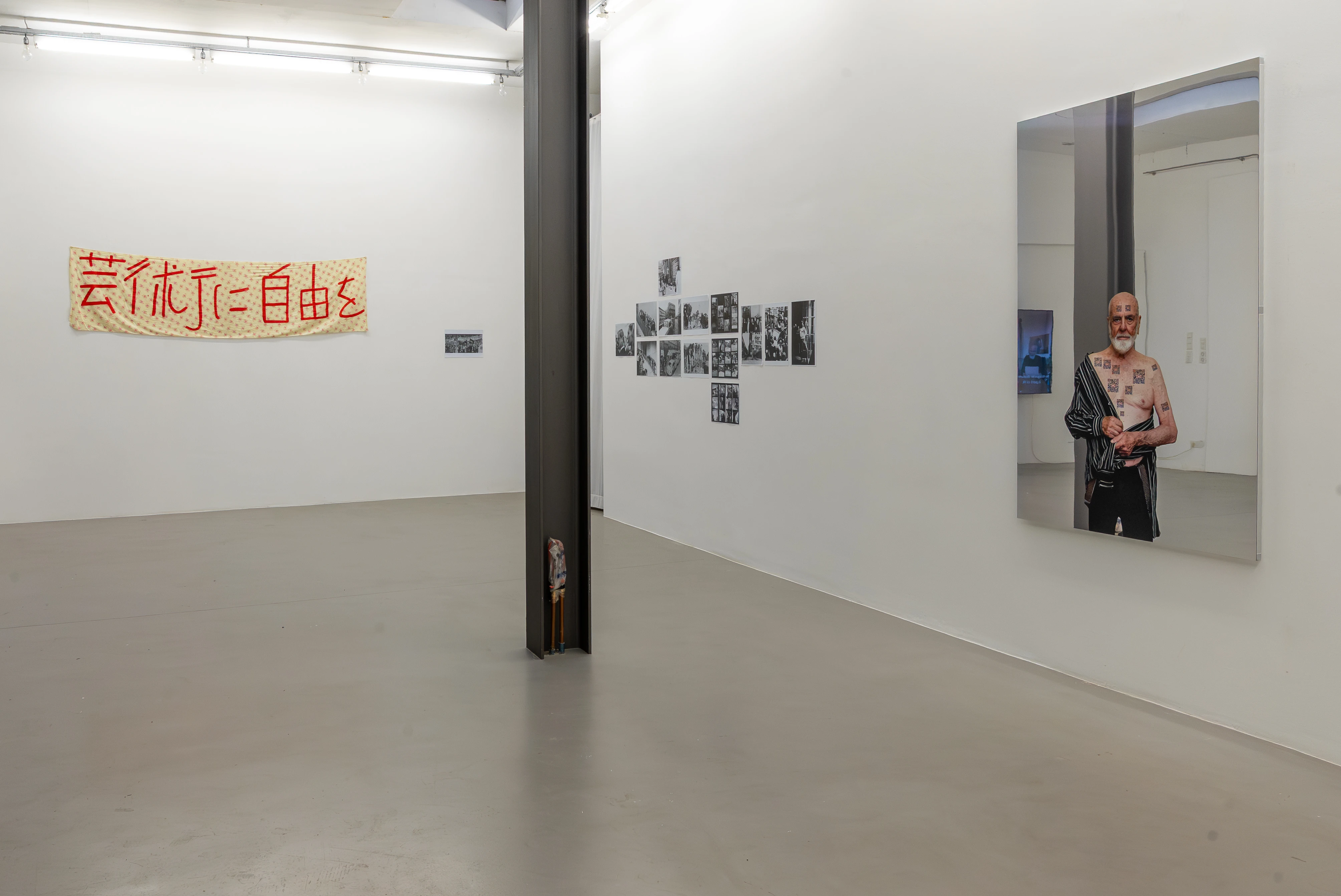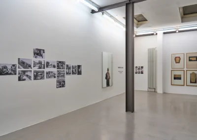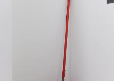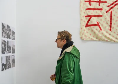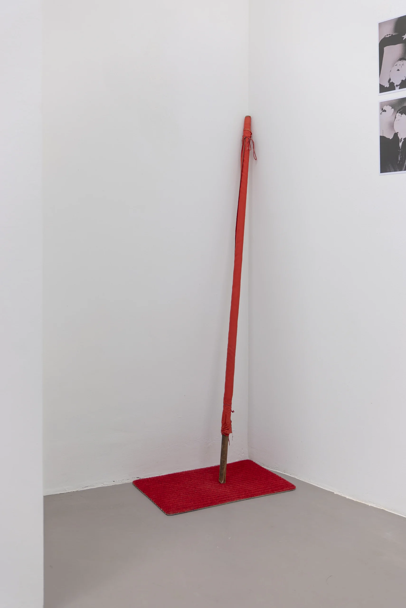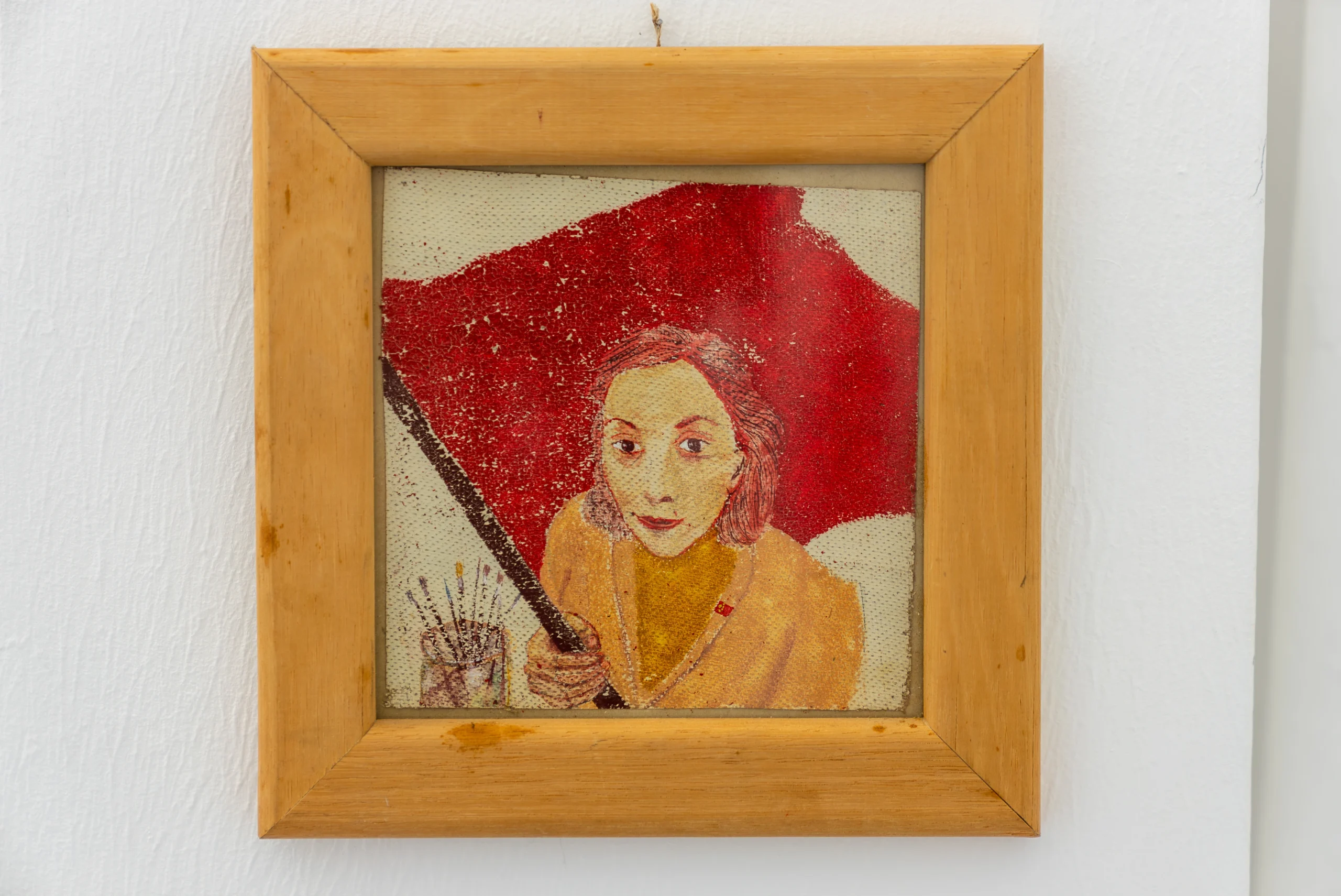 Ab den 80ger Jahren hüllte Erinna König sozial-politisch-gesellschaftlichen Vorstellungen in elegante Puzzle, die es von dem Betrachter selbst zu decodieren gilt. Die hier ausgestellten Werke sind seltene Momente in denen sie sich konkreter ausdrückte. Bei “o.T. Rote Fahne, “(1983) lehnt die gewickelte Fahne an der Wand, posiert auf einer roten Fußmatte; Das Miniatur “Selbst mit roter Fahne” ist ein Selbstportrait Erinna Königs in der sie eine eben solche rote Fahne trägt, mit einem Glas voller Malerpinsel neben sich — dieses kleine Selbstportrait von 1978 ist einzigartig und summiert ihre damalige Selbst-aufgabenstellung.