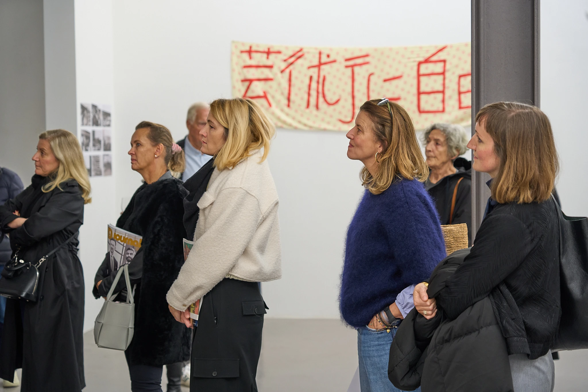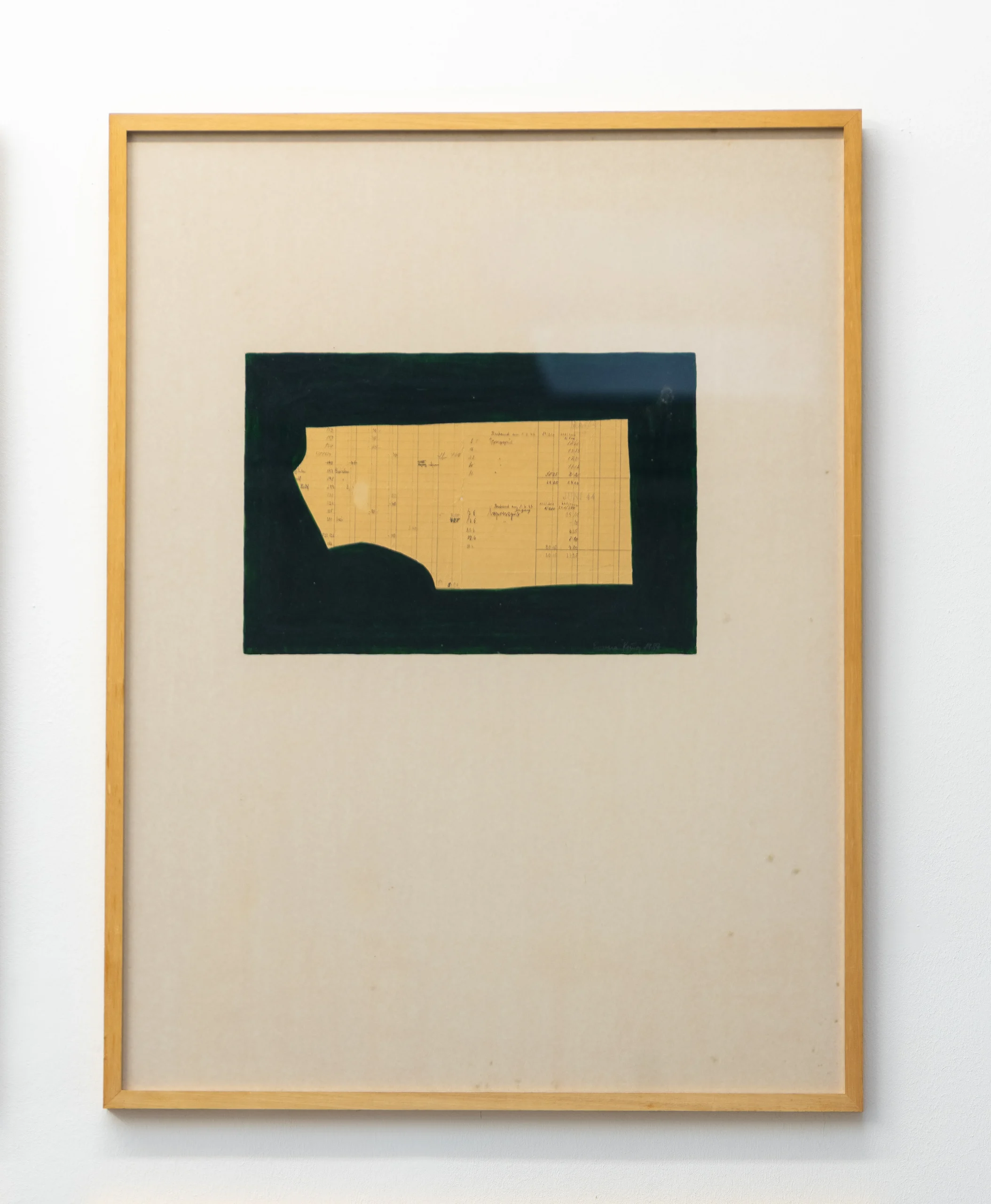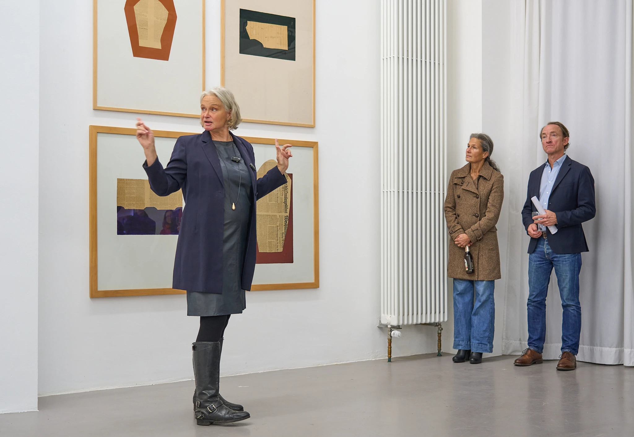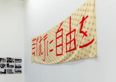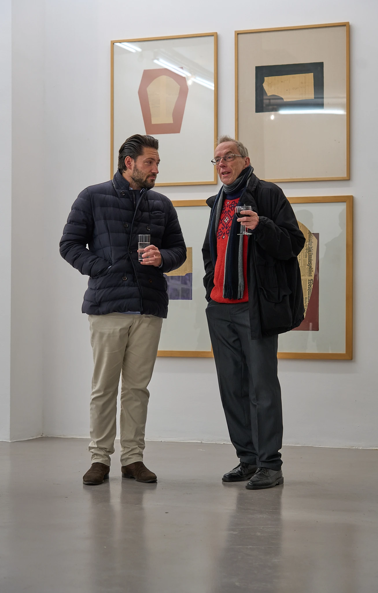 Ab den 80ger Jahren hüllte Erinna König sozial-politisch-gesellschaftlichen Vorstellungen in elegante Puzzle, die es von dem Betrachter selbst zu decodieren gilt. Die hier ausgestellten Werke sind seltene Momente in denen sie sich konkreter ausdrückte. Bei “o.T. Rote Fahne, “(1983) lehnt die gewickelte Fahne an der Wand, posiert auf einer roten Fußmatte; Das Miniatur “Selbst mit roter Fahne” ist ein Selbstportrait Erinna Königs in der sie eine eben solche rote Fahne trägt, mit einem Glas voller Malerpinsel neben sich — dieses kleine Selbstportrait von 1978 ist einzigartig und summiert ihre damalige Selbst-aufgabenstellung.