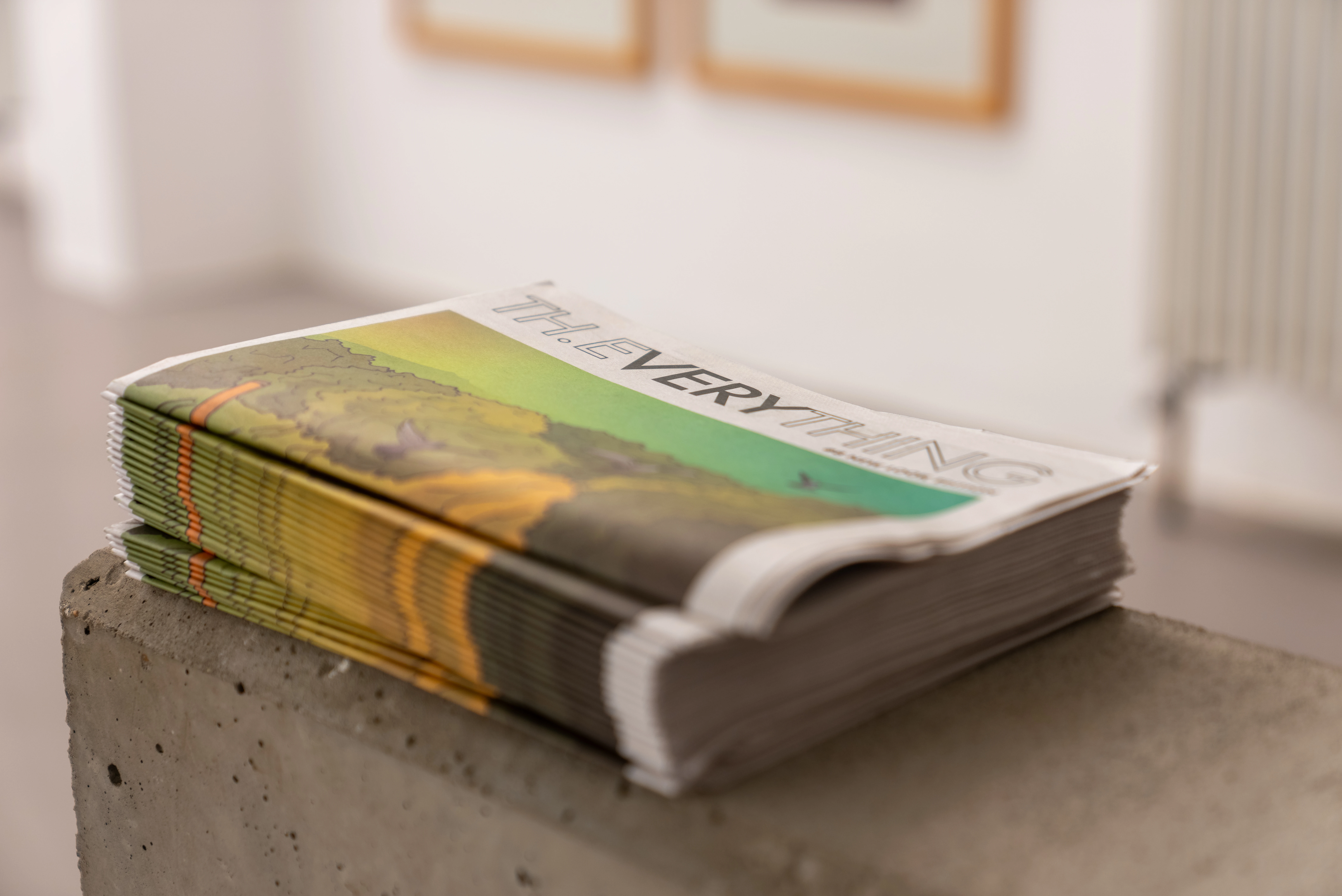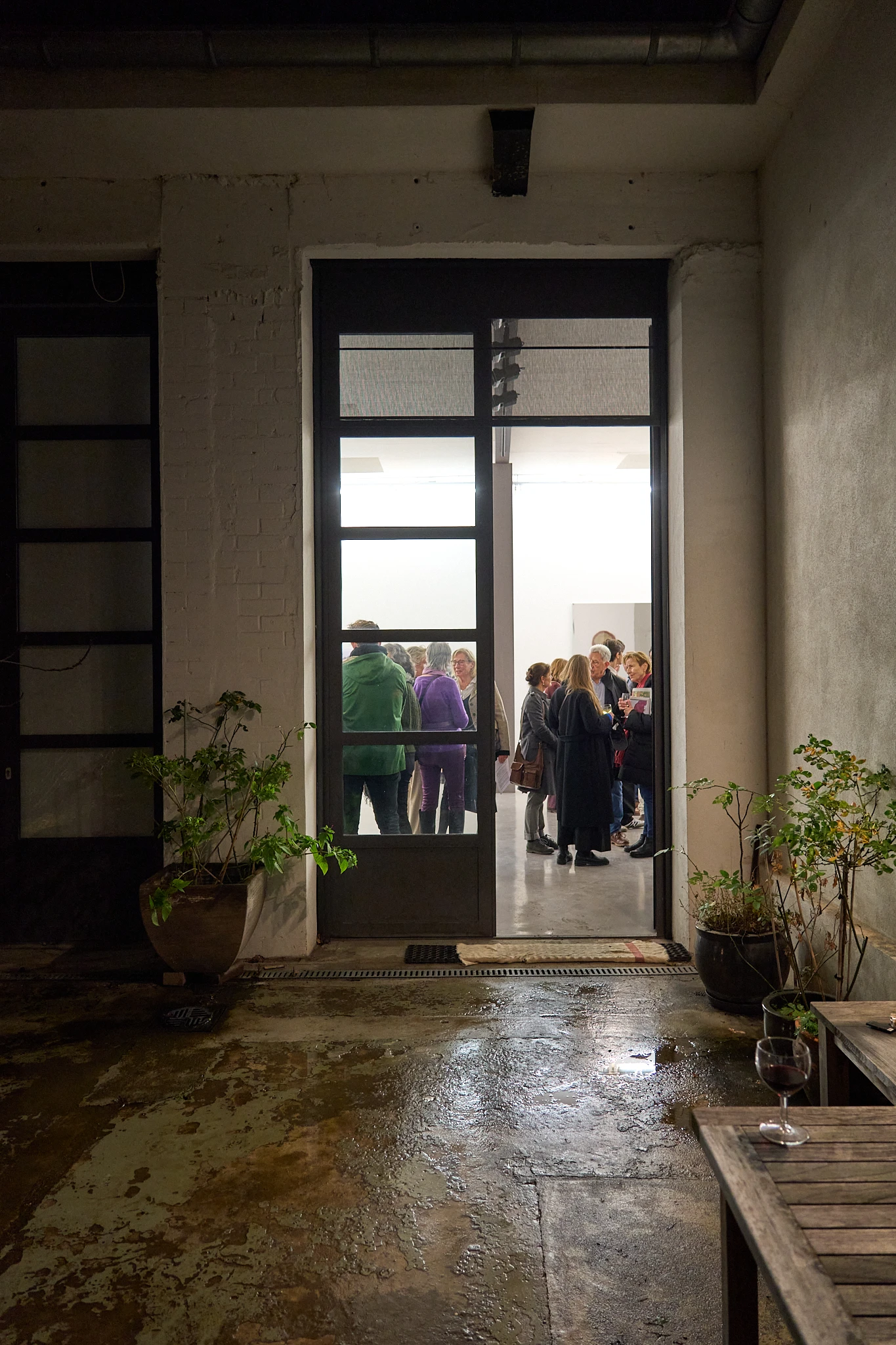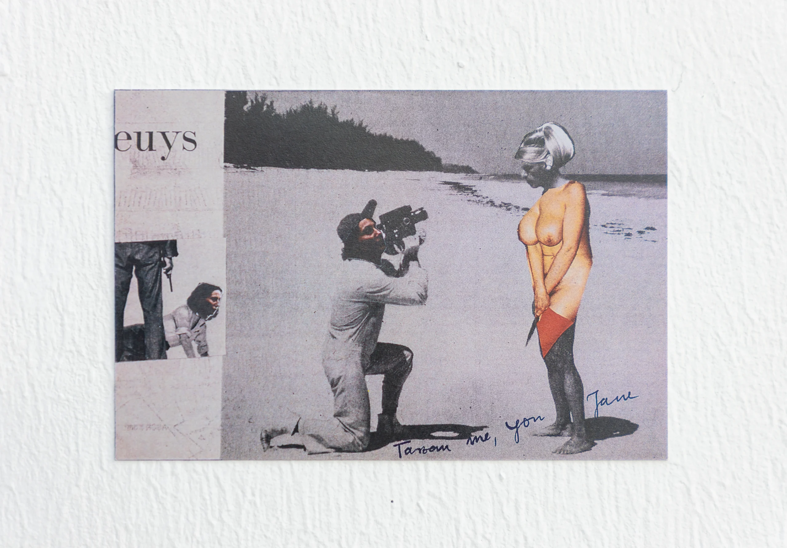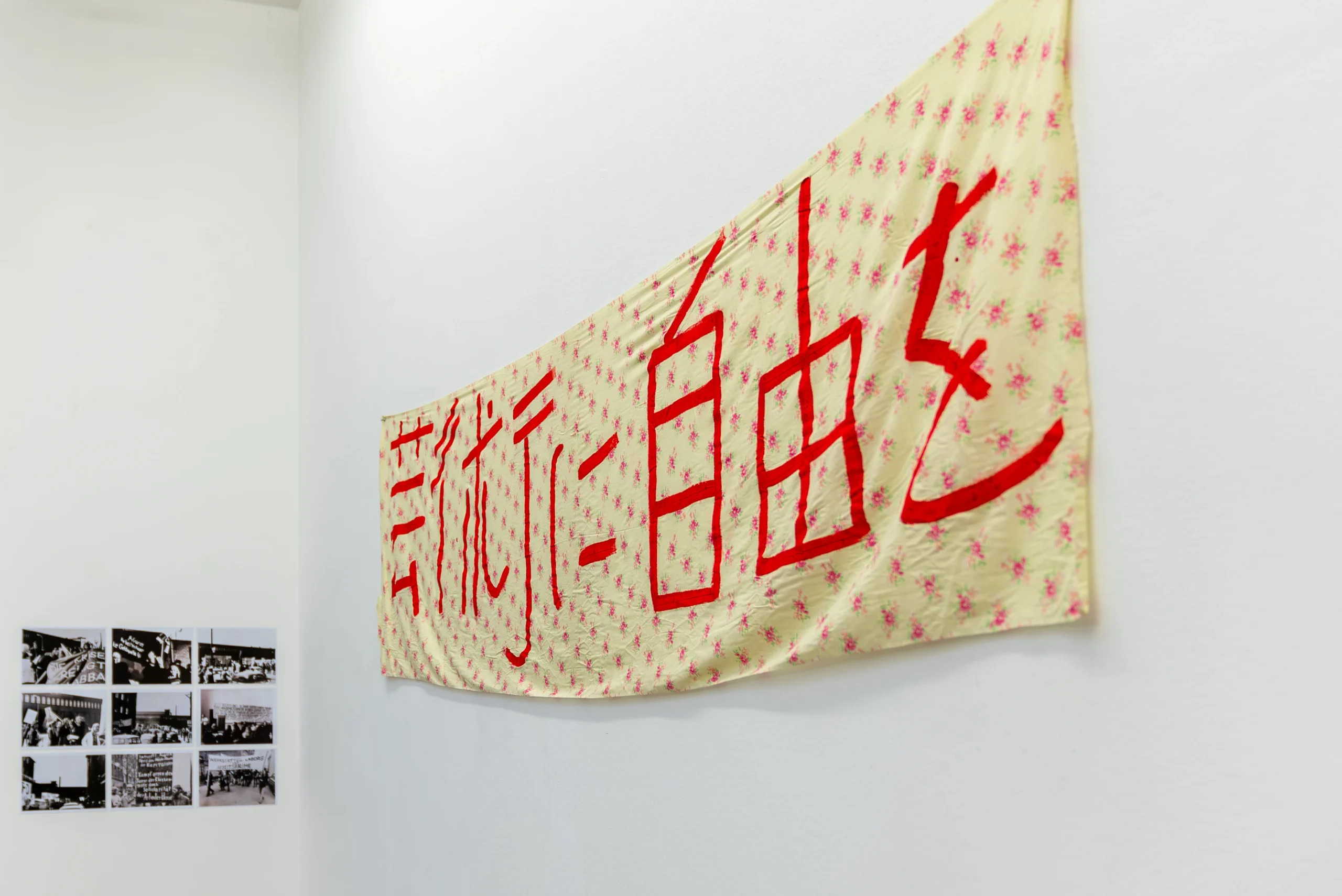 Ab den 80ger Jahren hüllte Erinna König sozial-politisch-gesellschaftlichen Vorstellungen in elegante Puzzle, die es von dem Betrachter selbst zu decodieren gilt. Die hier ausgestellten Werke sind seltene Momente in denen sie sich konkreter ausdrückte. Bei “o.T. Rote Fahne, “(1983) lehnt die gewickelte Fahne an der Wand, posiert auf einer roten Fußmatte; Das Miniatur “Selbst mit roter Fahne” ist ein Selbstportrait Erinna Königs in der sie eine eben solche rote Fahne trägt, mit einem Glas voller Malerpinsel neben sich — dieses kleine Selbstportrait von 1978 ist einzigartig und summiert ihre damalige Selbst-aufgabenstellung.