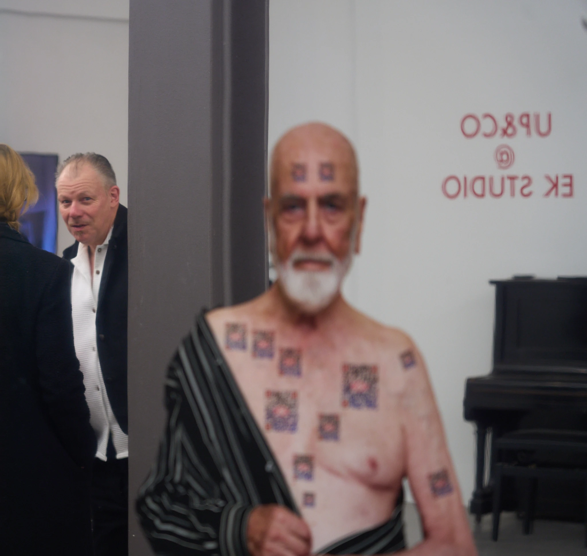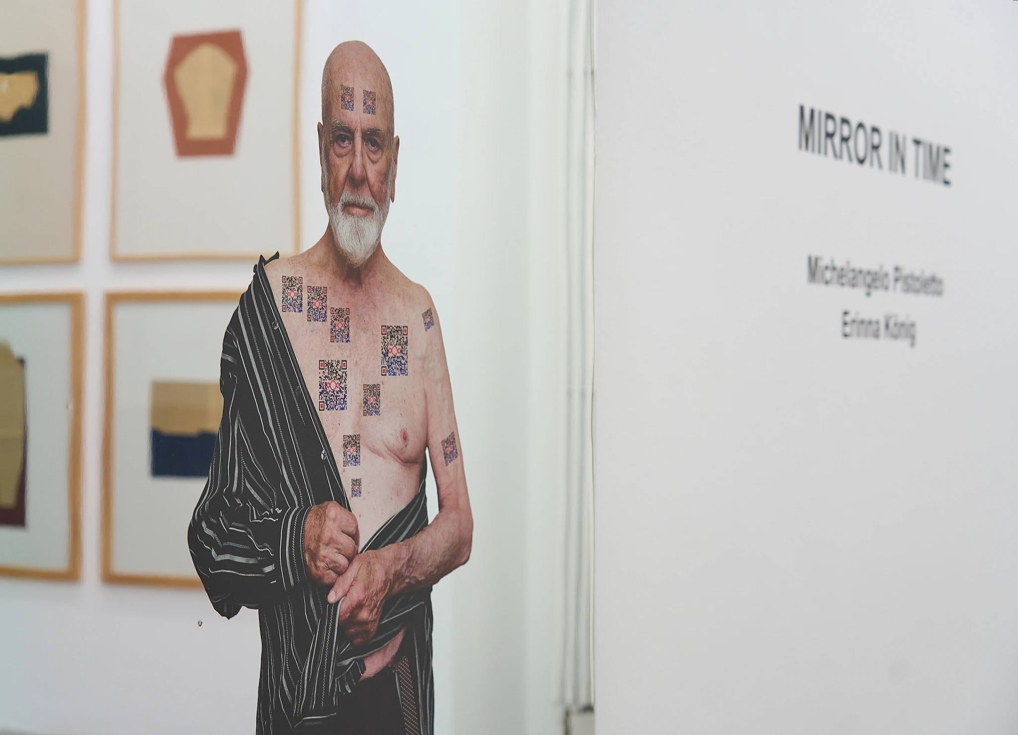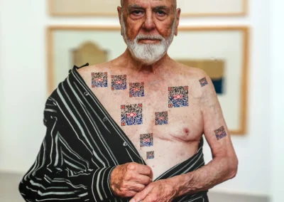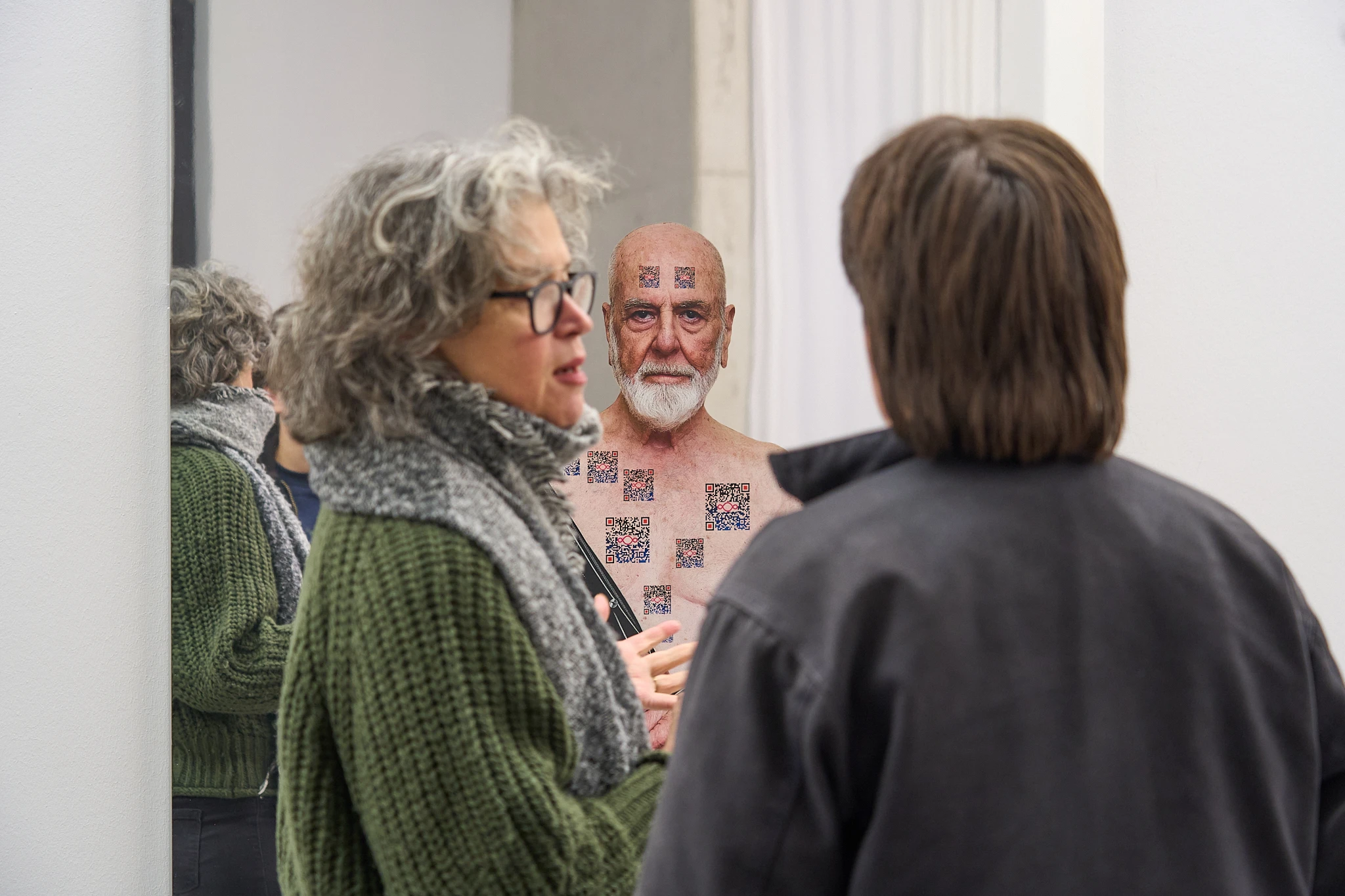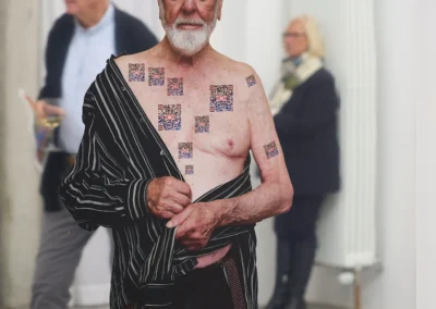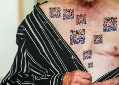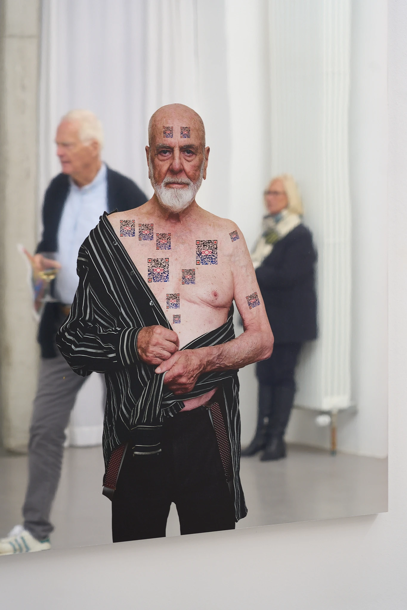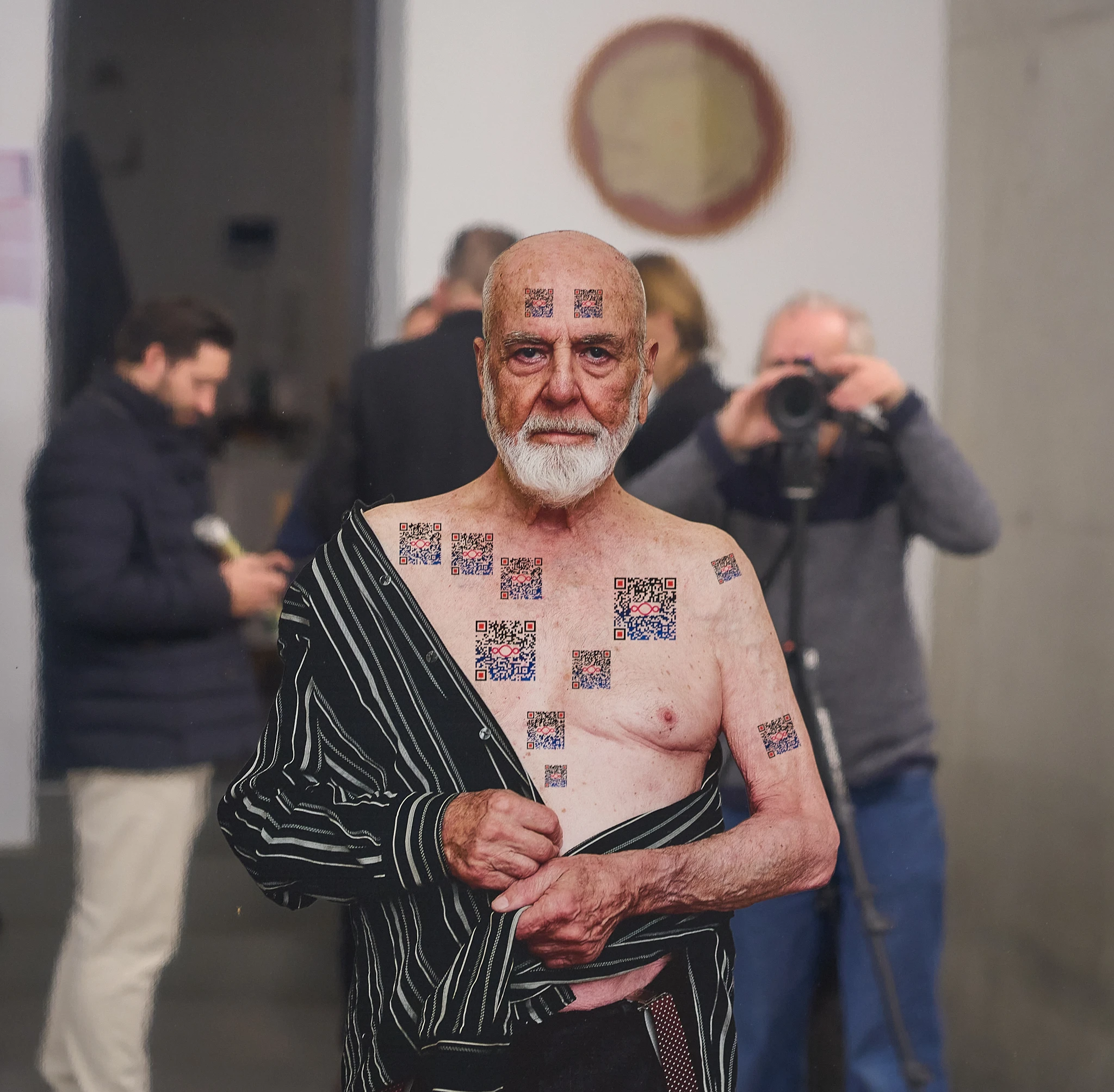 Gleichzeitig greift er der heutigen Diskussion über digitale Ausweise vor und nimmt Chip-Implantationen oder tätowierte QR-Codes auf dem menschlichen Körper, die frühere Nummern ersetzen, vorweg. Heute, im Jahr 2025, ist Autoritarismus im globalen Norden und Westen nicht mehr nur ein Schrecken der Vergangenheit, sondern wieder Realität geworden. Die Pläne der Wenigen die 99.99% zu kontrollieren, sind Orwells 1984 Dystopie in der heutigen Wirklichkeit, Chips im menschlichen Körper, Gesichtserkennung und Iris scans sind längst keine Phantasie mehr. Im Gegensatz zu totalitären Staaten die diese Form zu Kontrolle und eigenem Nutzen einsetzen, präsentieren Michelangelo Pistolettos QR Code Tattoos einen virtuellen ‘Spiegel des Selbst,’ bringen neue Dimensionen in das Selbstportrait.