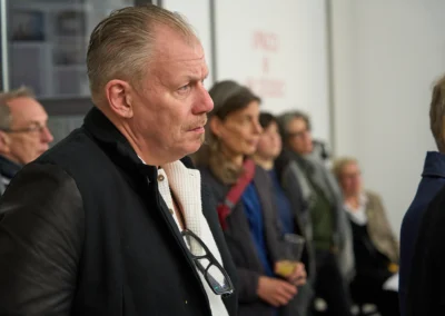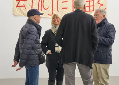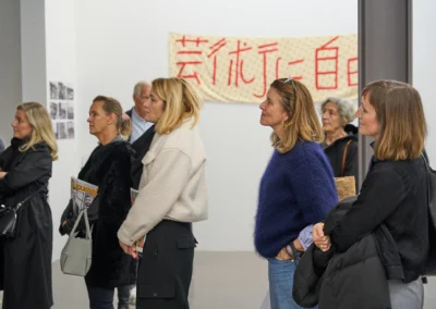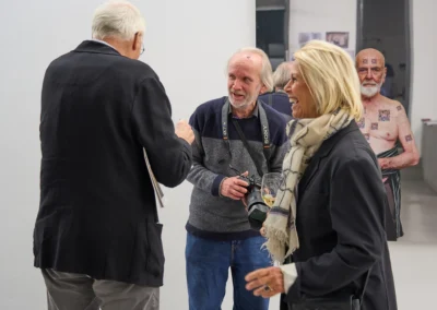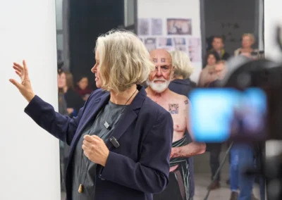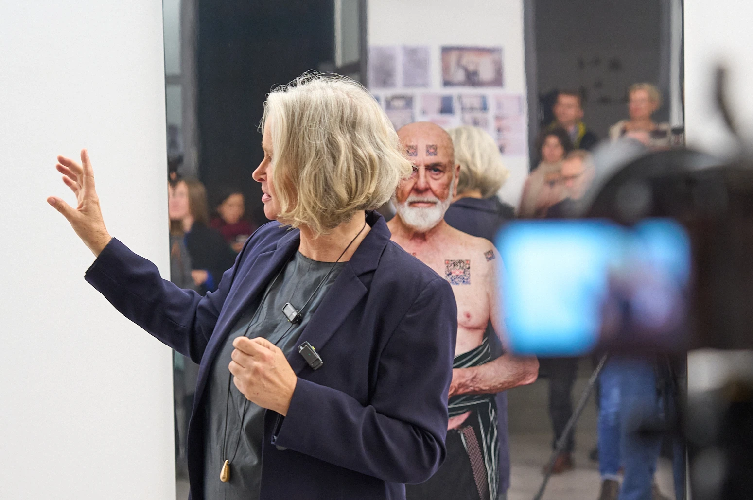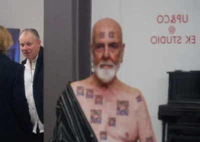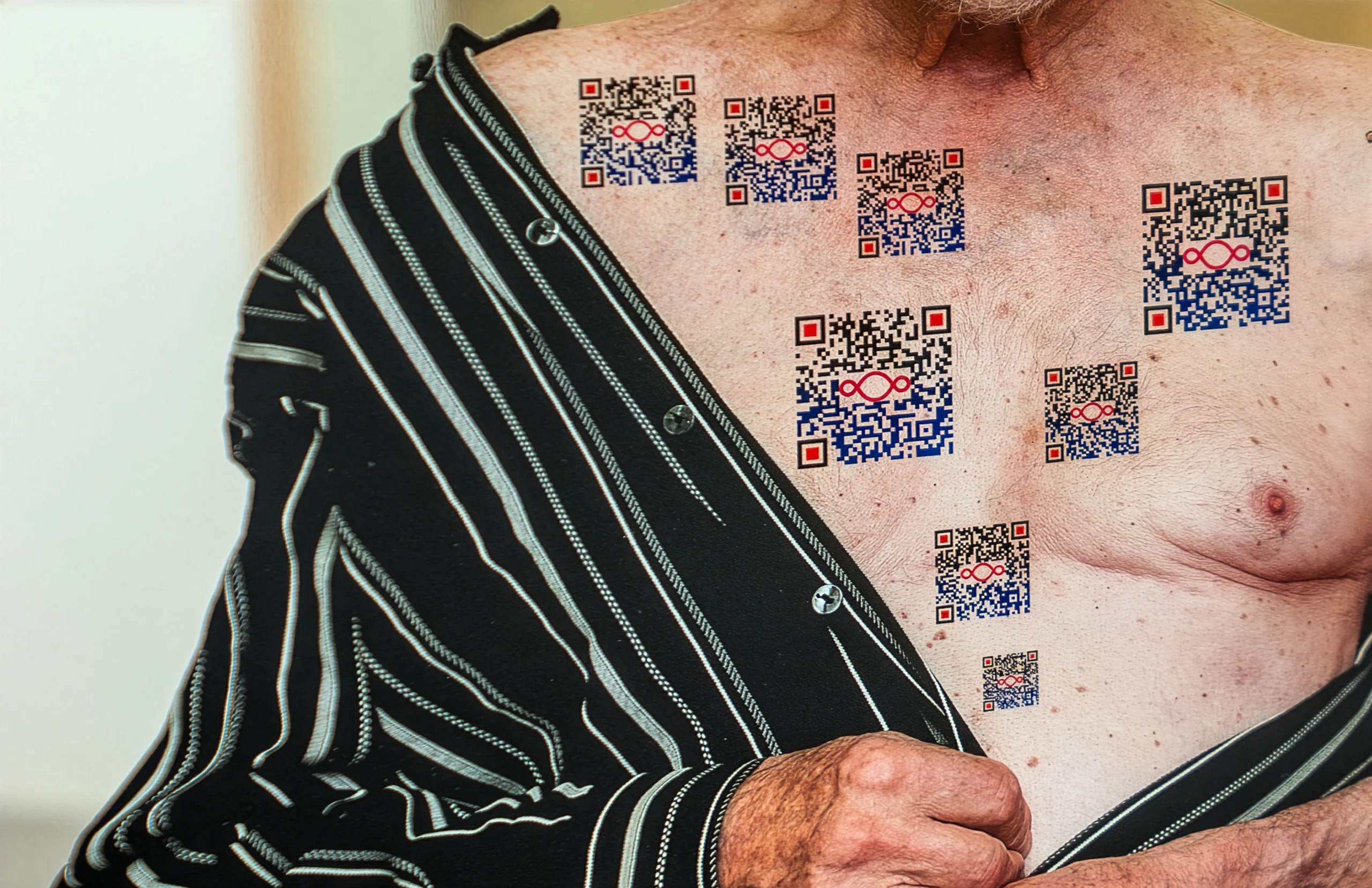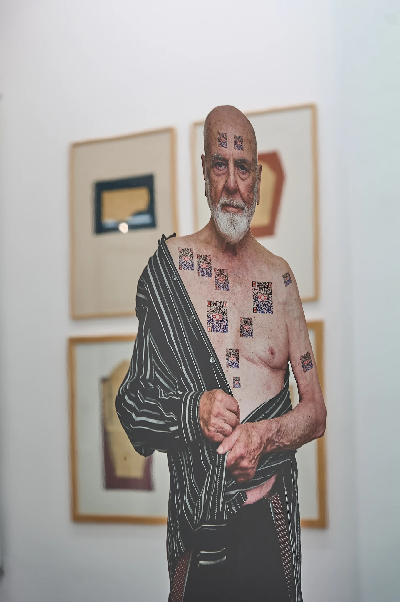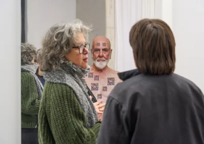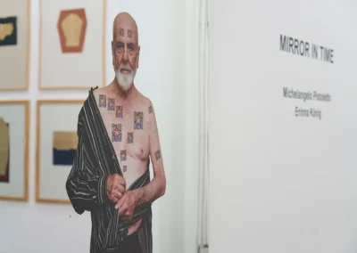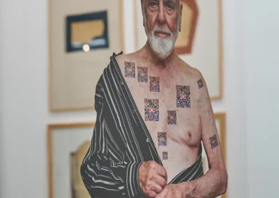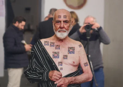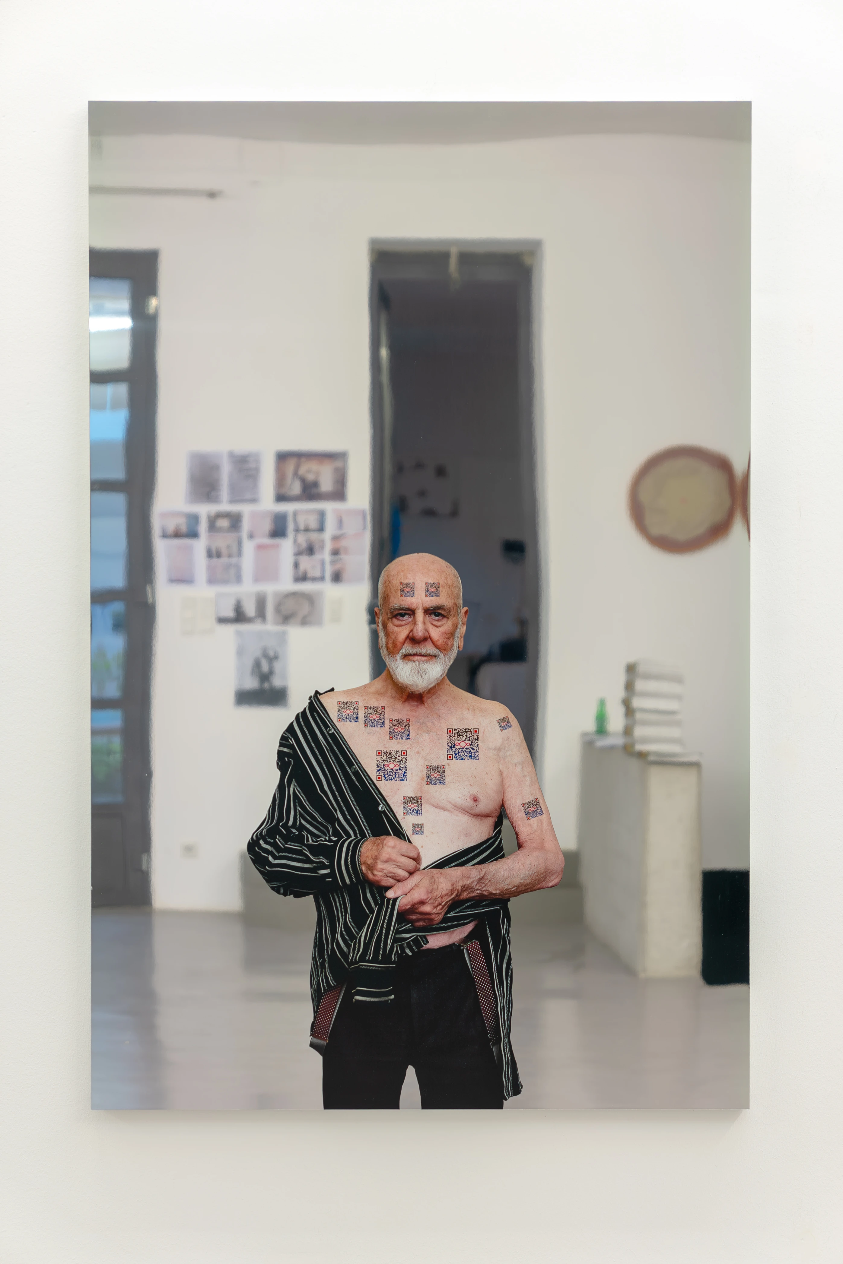 Gleichzeitig greift er der heutigen Diskussion über digitale Ausweise vor und nimmt Chip-Implantationen oder tätowierte QR-Codes auf dem menschlichen Körper, die frühere Nummern ersetzen, vorweg. Heute, im Jahr 2025, ist Autoritarismus im globalen Norden und Westen nicht mehr nur ein Schrecken der Vergangenheit, sondern wieder Realität geworden. Die Pläne der Wenigen die 99.99% zu kontrollieren, sind Orwells 1984 Dystopie in der heutigen Wirklichkeit, Chips im menschlichen Körper, Gesichtserkennung und Iris scans sind längst keine Phantasie mehr. Im Gegensatz zu totalitären Staaten die diese Form zu Kontrolle und eigenem Nutzen einsetzen, präsentieren Michelangelo Pistolettos QR Code Tattoos einen virtuellen ‘Spiegel des Selbst,’ bringen neue Dimensionen in das Selbstportrait.