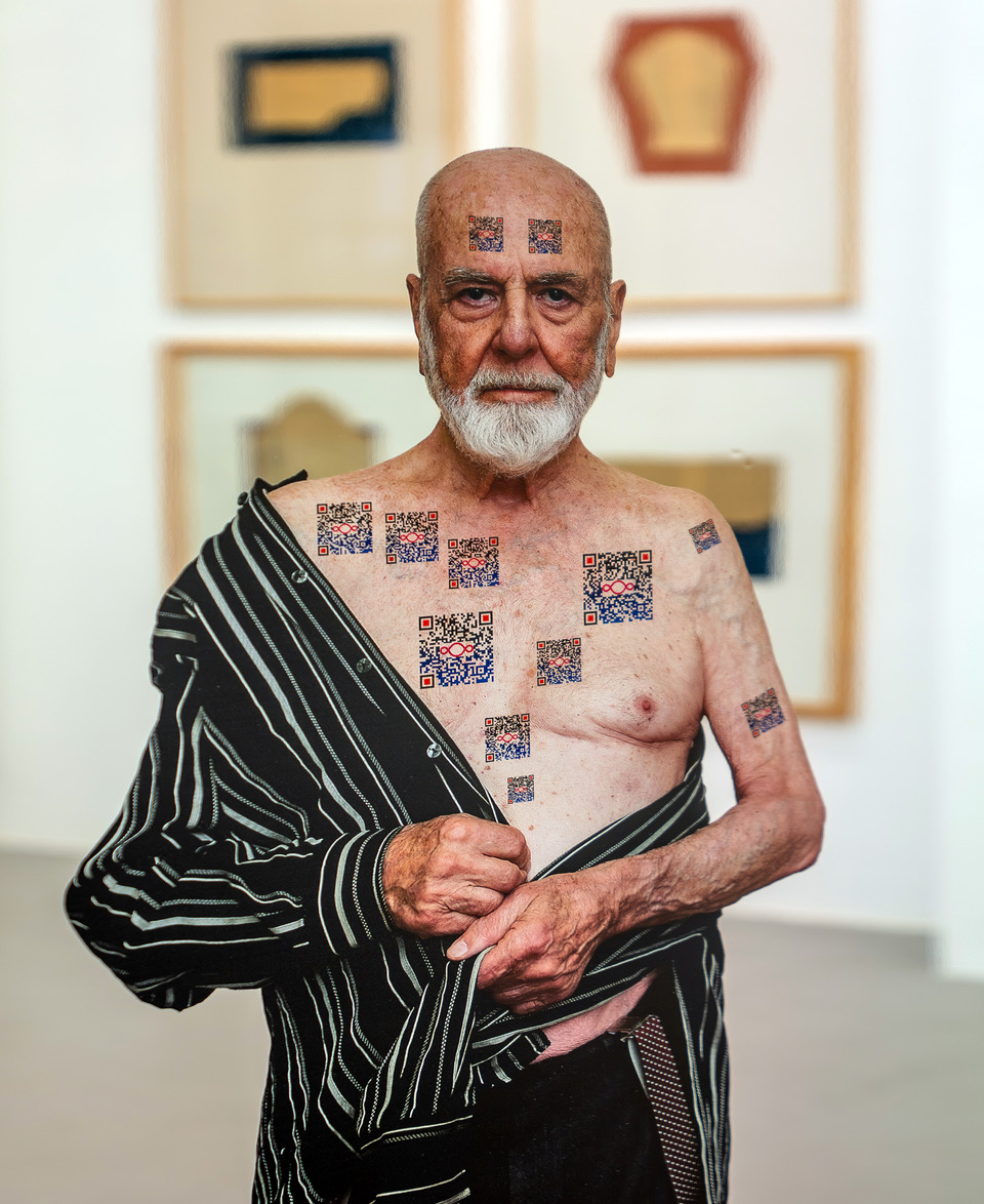 Mit dem Werk “QR Code Possession – Autoritratto,” das 2019-2023 kreiert wurde, bezieht sich Michelangelo Pistoletto auf Tribal Tattoos, die traditionell Zugehörigkeit und persönliche Identität von Volksstämmen kommunizieren. Mit diesem Werk, indem seine QR Codes auf die speziell angelegte Webseite www.qrcodepossession.net leiten, stellt Michelangelo Pistoletto unsere Identifikation mit dem Virtualen, dem “digitalen Selbst” und den Sozialen Medien in den Vordergrund.