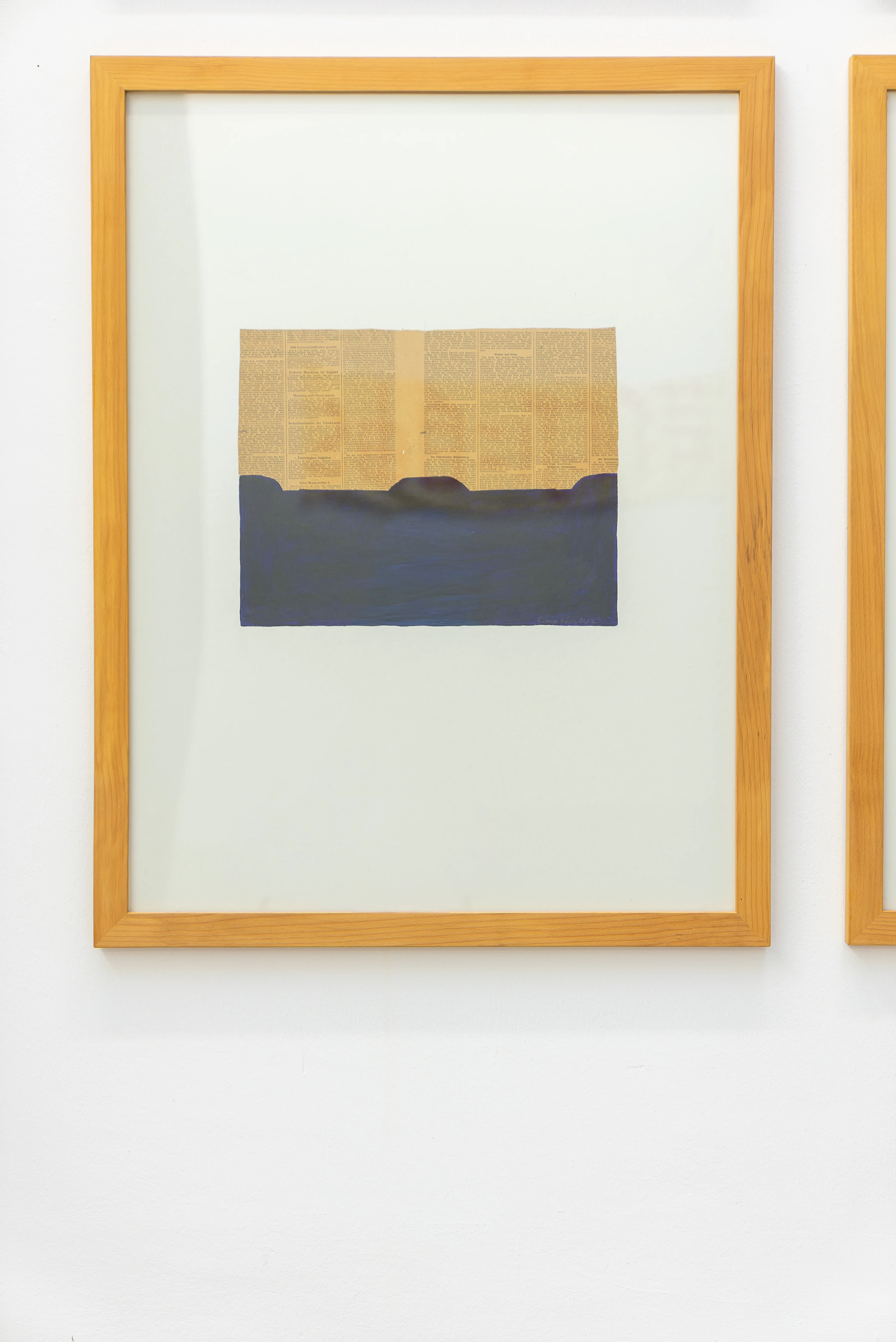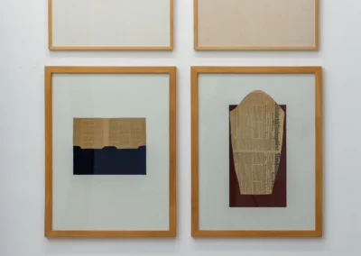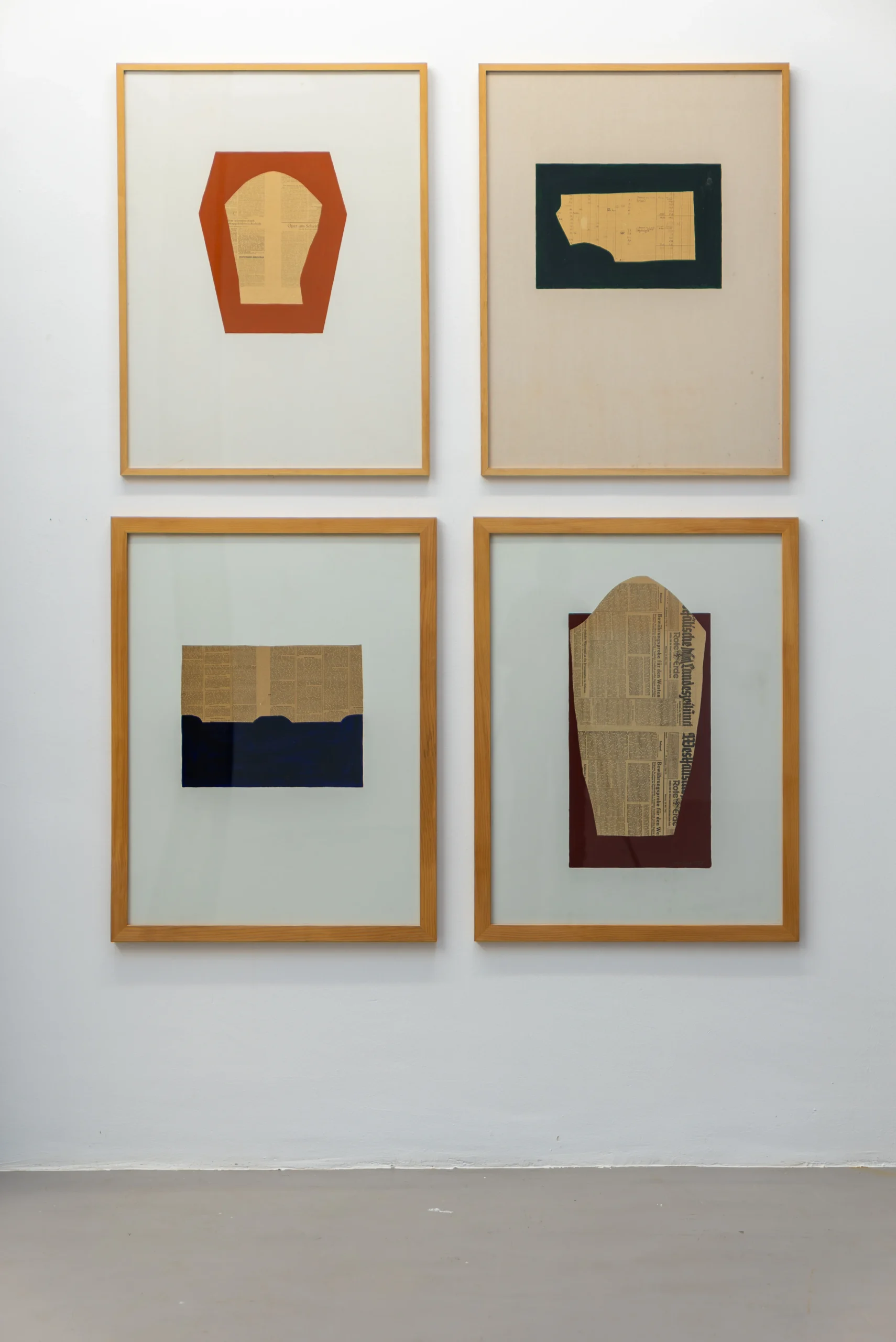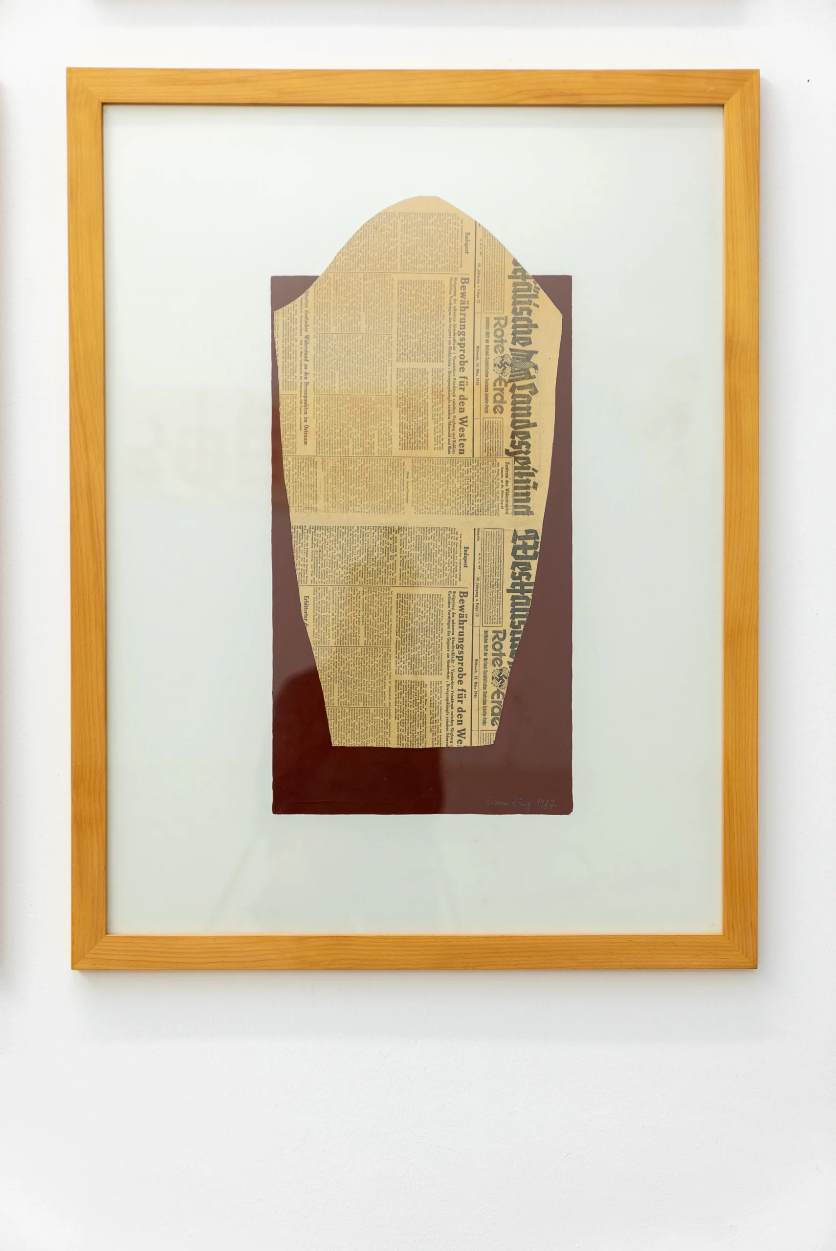 Polar entgegengesetzt ist die Gruppe der Papierarbeiten “Schnittmuster,” 1987. Schneiderschnittmuster eines kurzen Ärmels, eines Jacken/Hemdenärmels und eines Kinderjäckchens sind Zeitungspapiercollagen auf schwarzen oder tonrotem Hintergrund oder Nachthimmel lila-schwarz übermalt. “Schnittmuster Westen und Osten”, “Expressgut”, “Rote Erde”,”Attentatsversuch”, beziehen sich auf Inhalte und die Zeitung selbst: