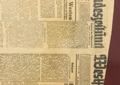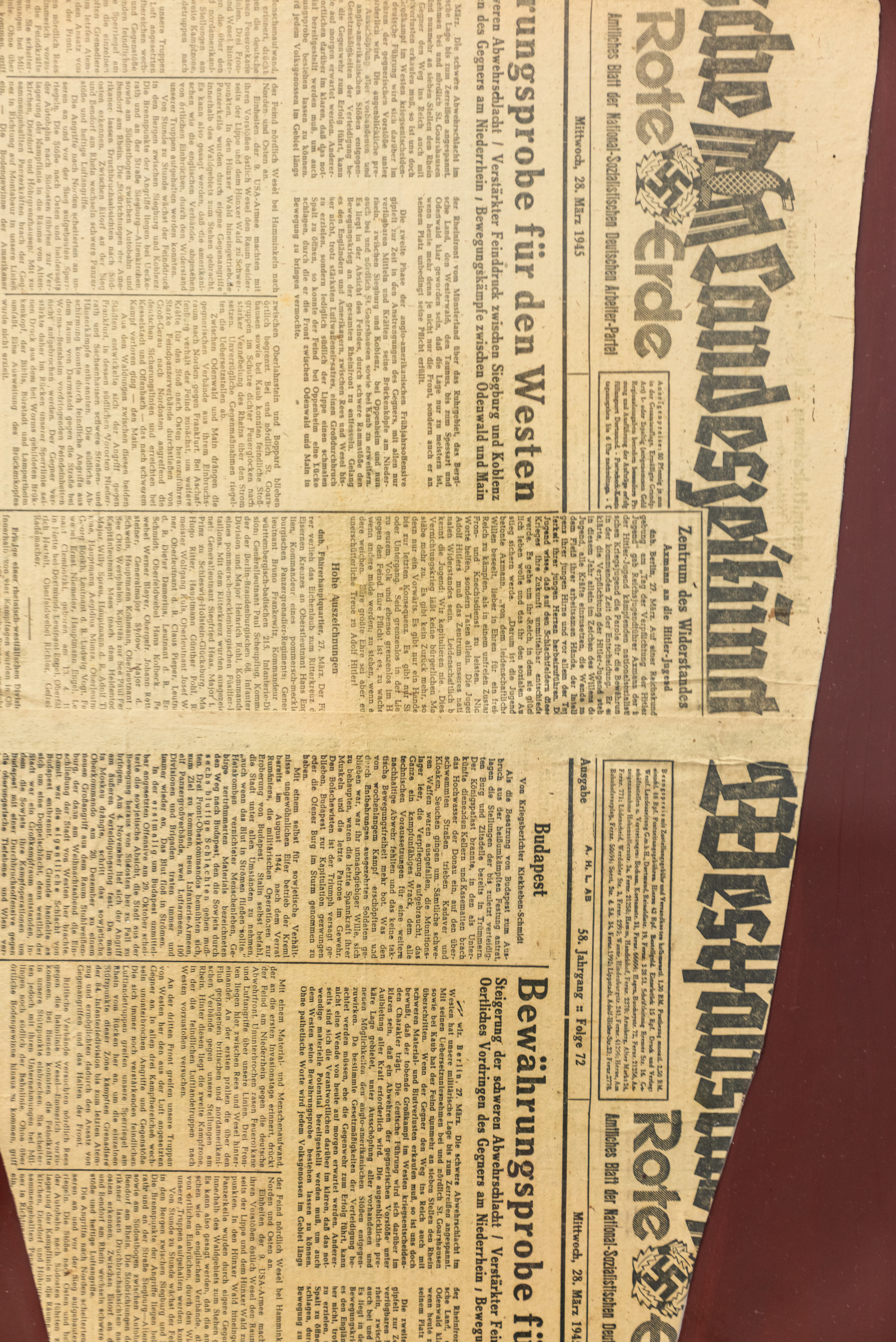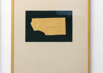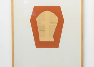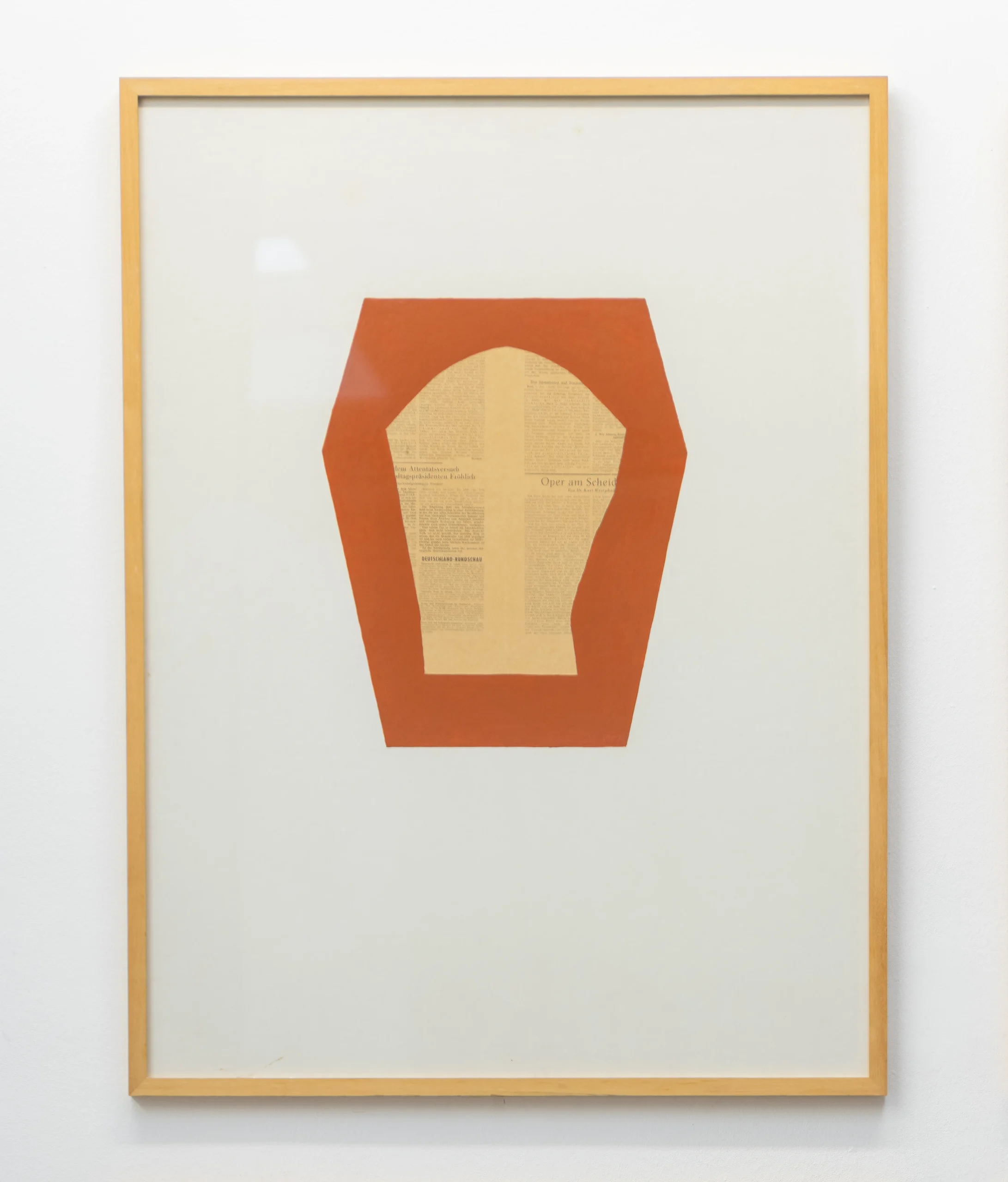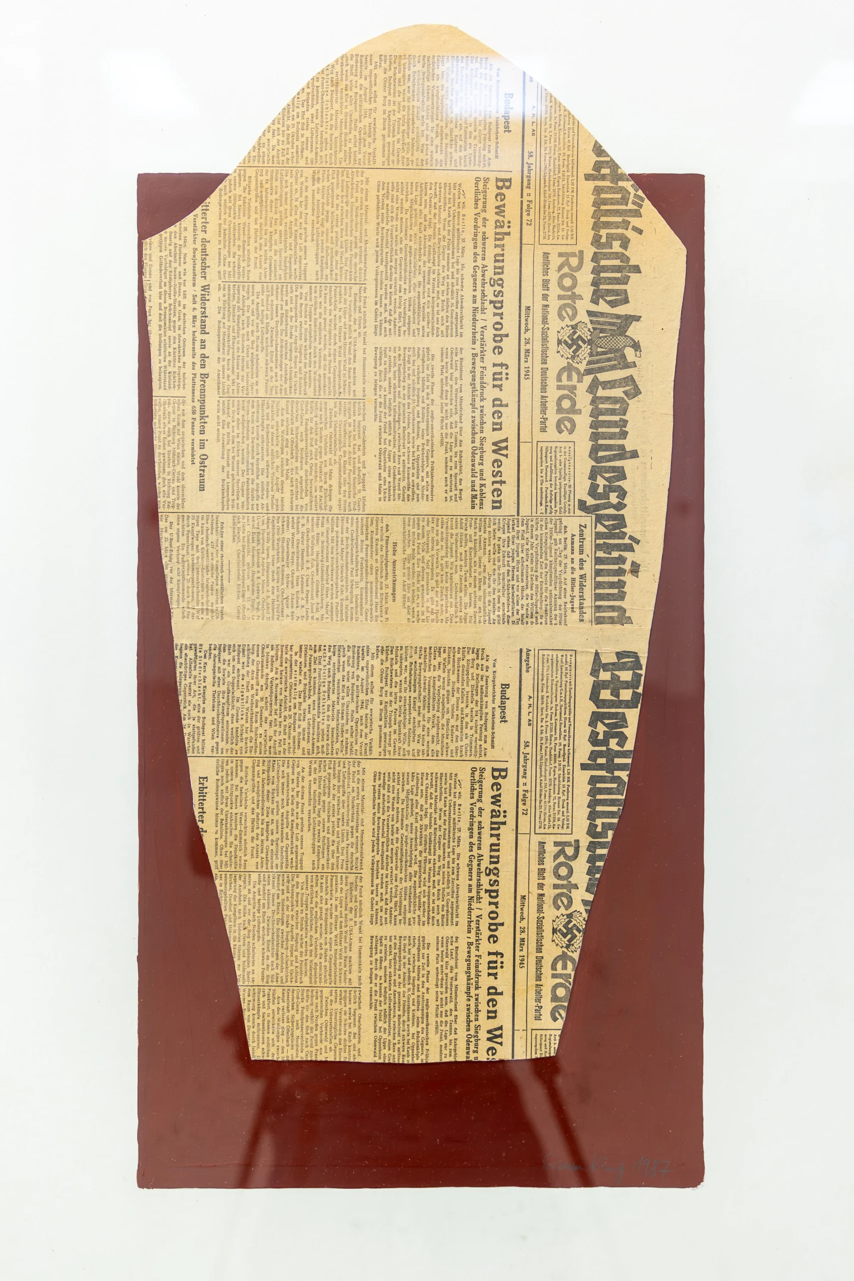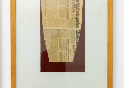 “Rote Erde oder rothe Erde” ist eine seit dem Mittelalter belegte Bezeichnung für die historische Landschaft Westfalen in der Erinna König als Kind aufwuchs. Die “Westfälische Landeszeitung – Rote Erde,” war 1933-1945 eine Kombination von Amtsblatt und Parteizeitung der NSDAP und Kampfblatt für nationalsozialistische Politik. Mit Erinna Königs Serie “Zeitungsschnittmuster” wird dem Leser die NSDAP Parteipropaganda direkt auf den Leib geschneidert. Erwachsene wie Kinder werden so geformt, eingereiht und geistig wie körperlich eingekleidet in Parteitreue. Das ‘Schnittmuster, Expressgut” ist ein Kinderhemdbrustteil aus einem “Juni 44” gestempelten Wirtschaftsprüfer Bilanzbogen geschnitten, in Anspielung auf die kriegs-kalkulierte Familienpolitik des 3. Reiches.