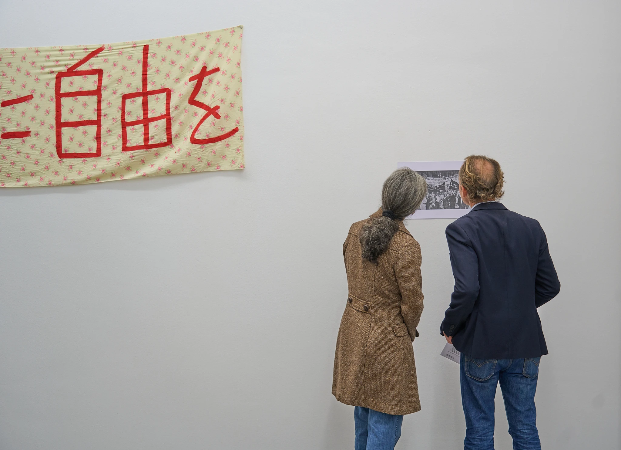 “Das Ende der Rolle,” 1990, nimmt direkten Bezug auf die Protestaktionen von damals: ein rund gerahmtes Werk aus gefaltetem Packpapier – dem “Ende der Papier-Rolle” die für Demonstrationsbanner gebraucht wurden, gestempelt mit einem roten Stern im Zentrum.